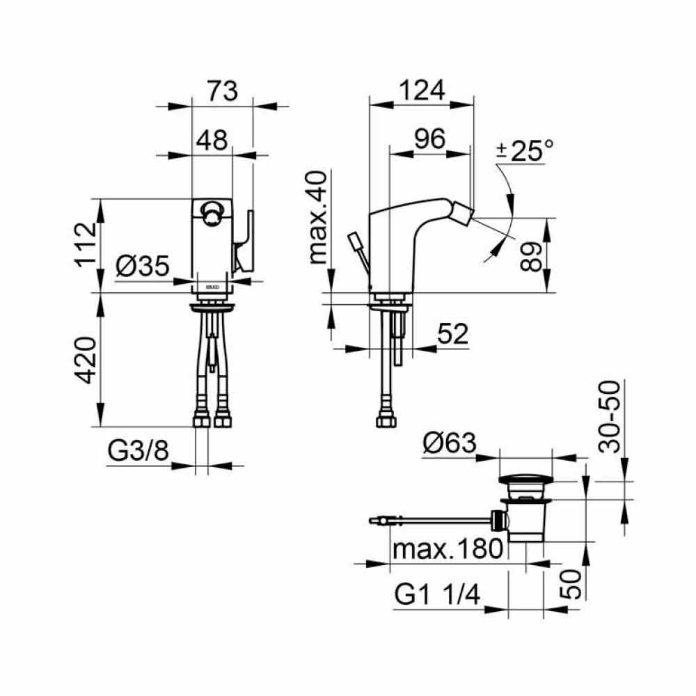 Modern bidet tap in chrome-plated brass with pop -up waste.