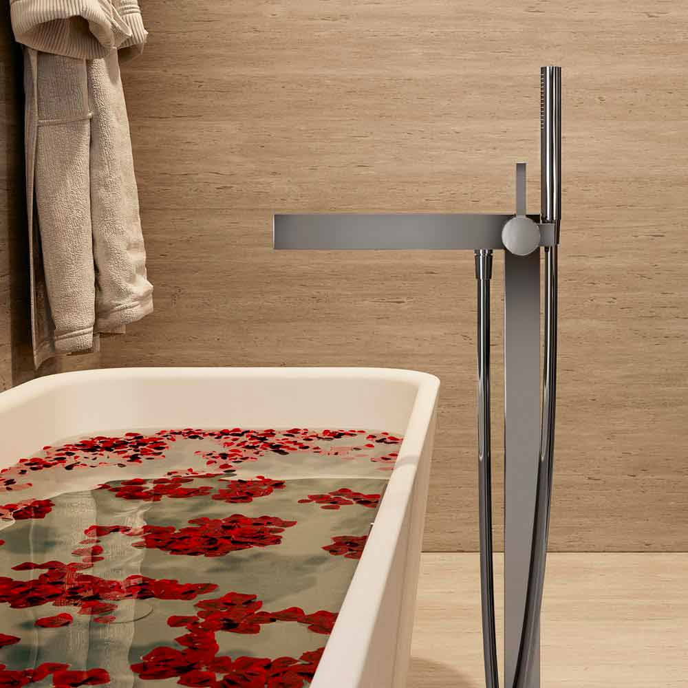 This wonderful and elegant queue of bathroom taps combines round and square shapes to create unique and luxurious environments. Its design is exclusive and proves capable of revolutionizing the furnishing of any bathroom with a modern taste in an elegant and refined way. It also features a practical and functional conversion from a spout to a hand shower integrated in the taps so that you can quickly and easily switch from one mode to another in a single operation.