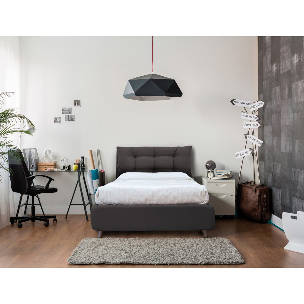 Model with standard container: padded bed frame with supported base included and comfortable 11 cm high foot which allows cleaning under the structure. Container with oblique opening which adds the practicality of a large compartment with incredible capacity.
