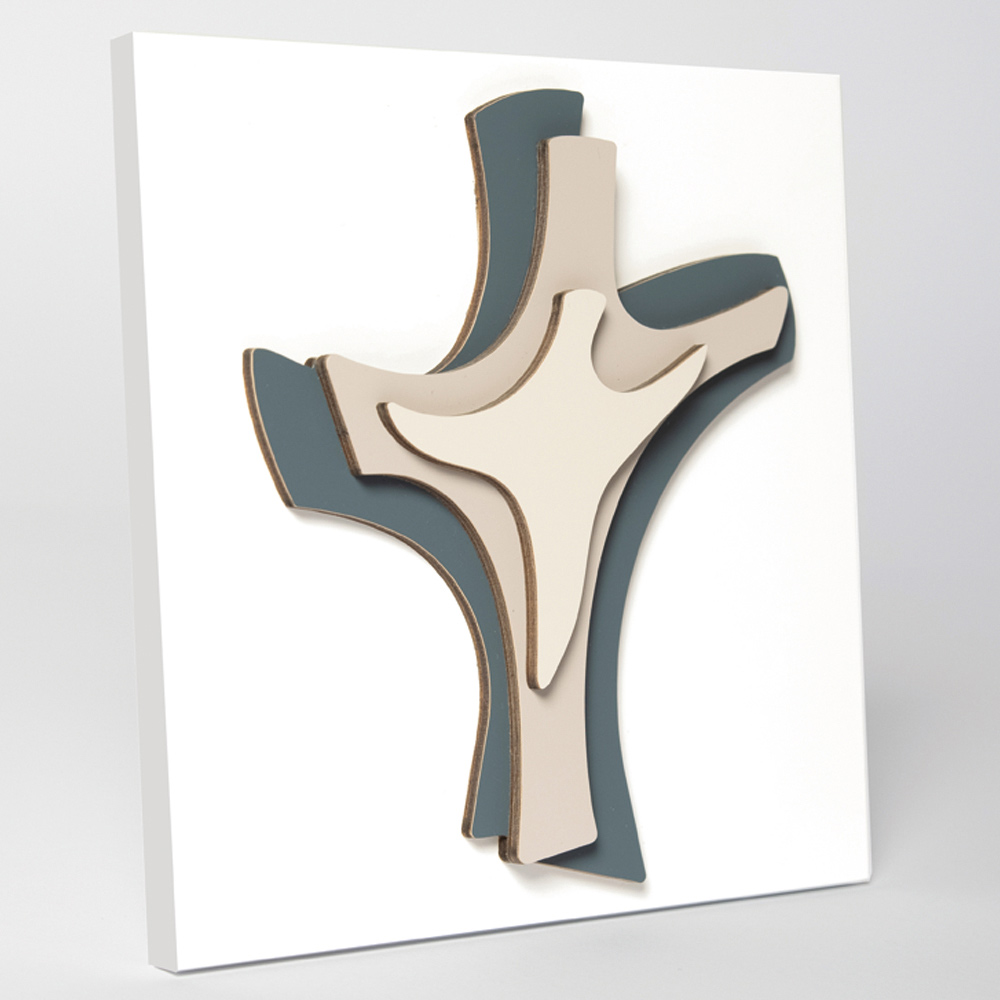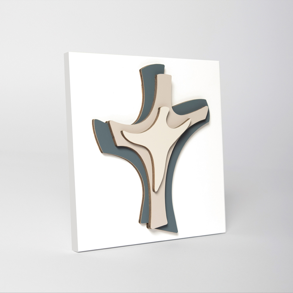 Sacred picture with application of the blue cross, gravel and sand. Matt white lacquered panel with hole for hanging it on the wall and foot for the support. Ā
