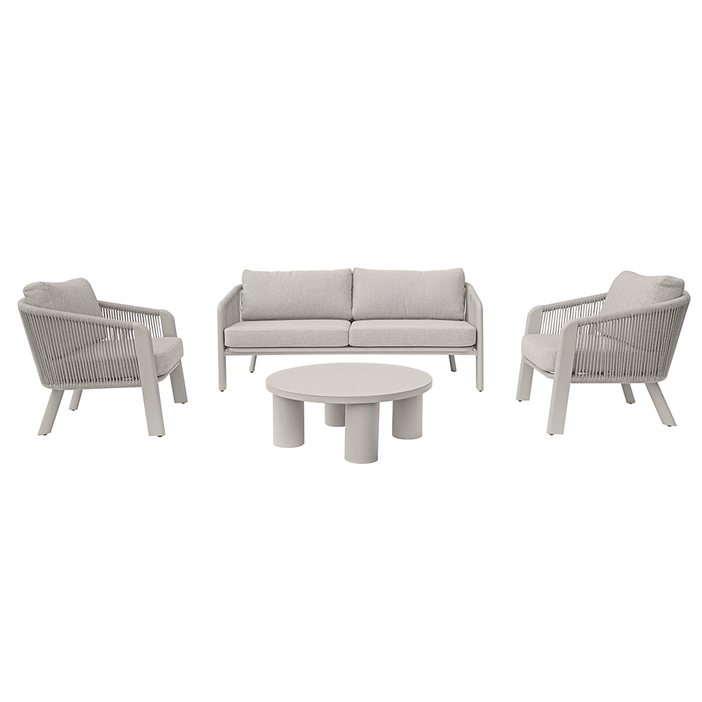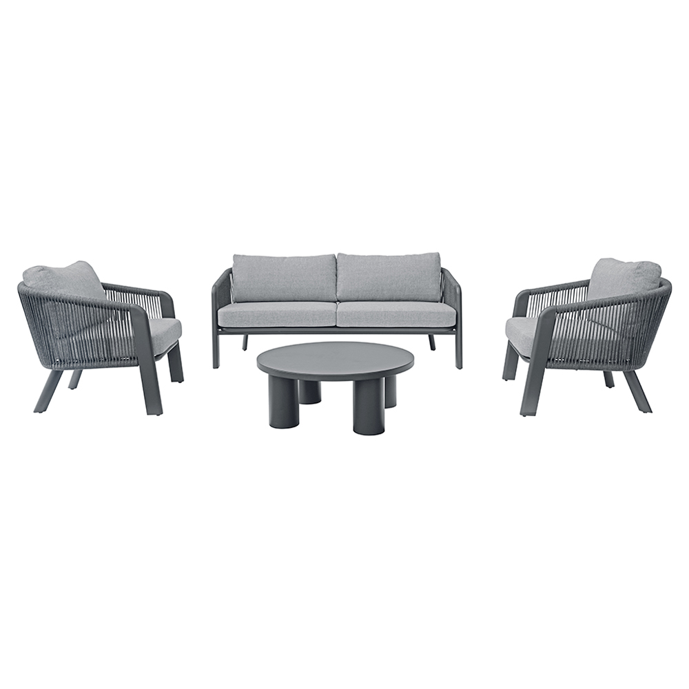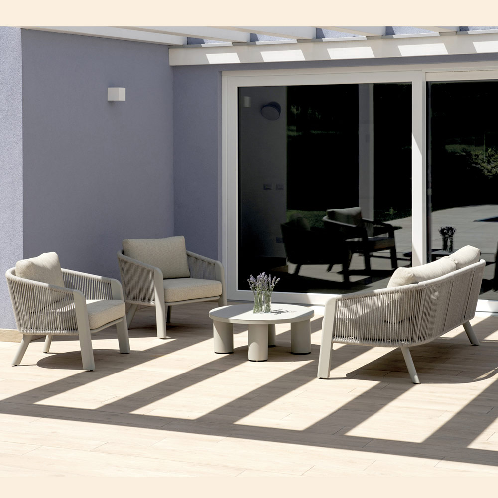 The aluminum frame ensures lightness, solidity, and durability, while the woven rope elegantly wraps the seats and backrests, creating a modern yet natural visual effect. The removable cushion covers ensure maximum comfort and easy maintenance, maintaining the living room's neat and refined appearance over time.