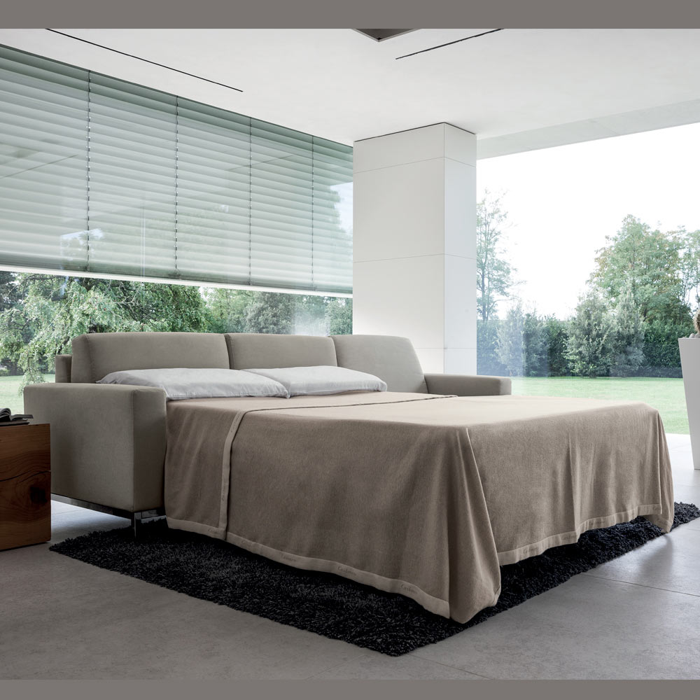 chromed metal. The sofa bed is a versatile and elegant piece, perfect for modern spaces. Its transformability allows for an easy transition from sofa to bed, offering a practical solution for guests. The simple yet refined design, with clean queues and high-quality fabric upholstery, makes it aesthetically pleasing. The soft cushions ensure comfort both as a sofa and as a bed. It is the harmony between functionality, comfort and modern style.