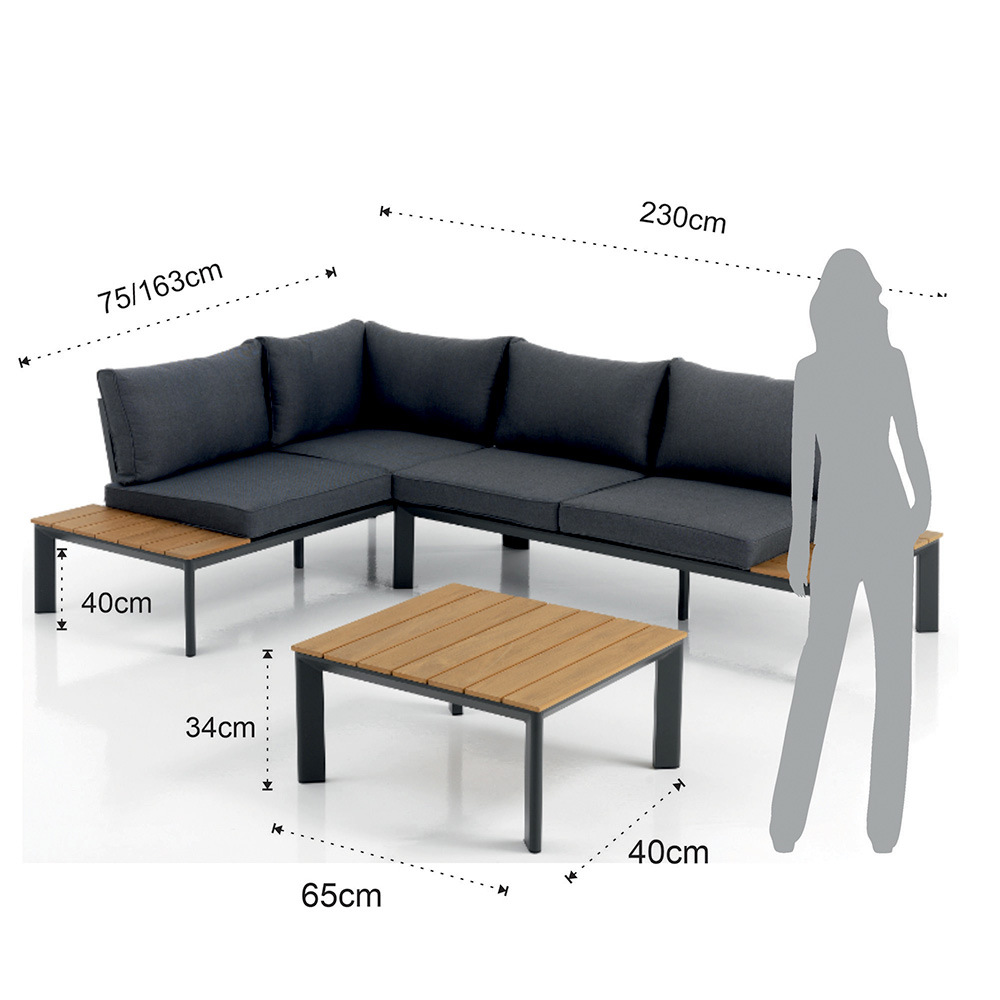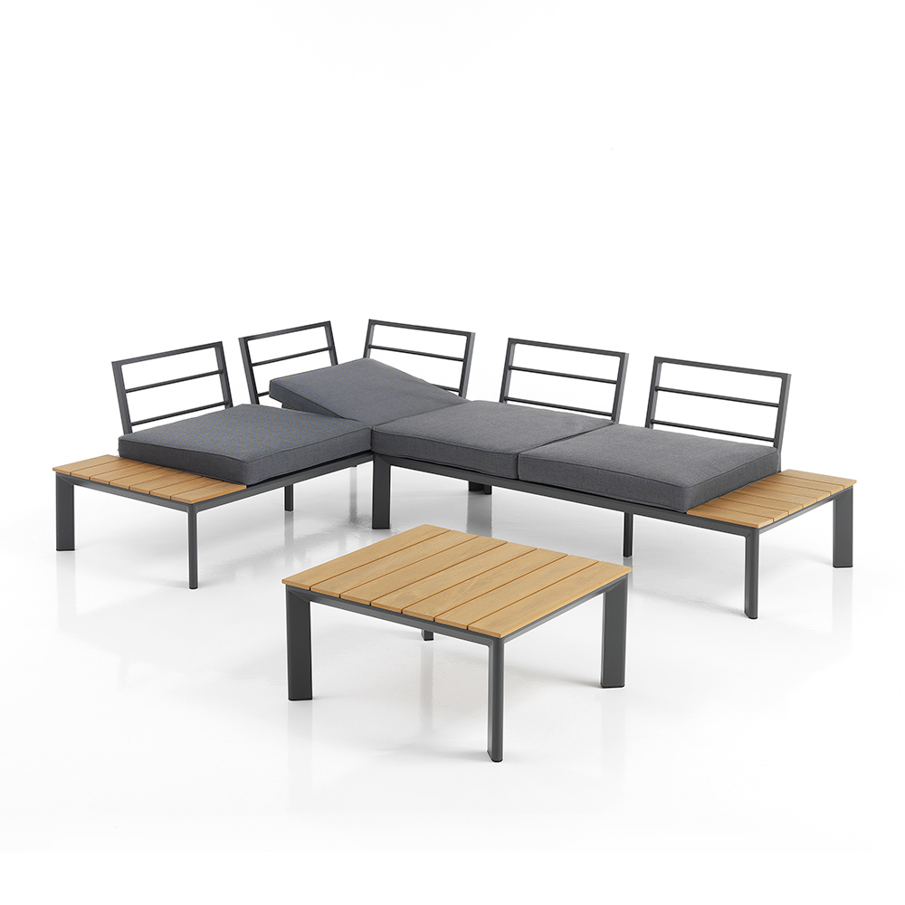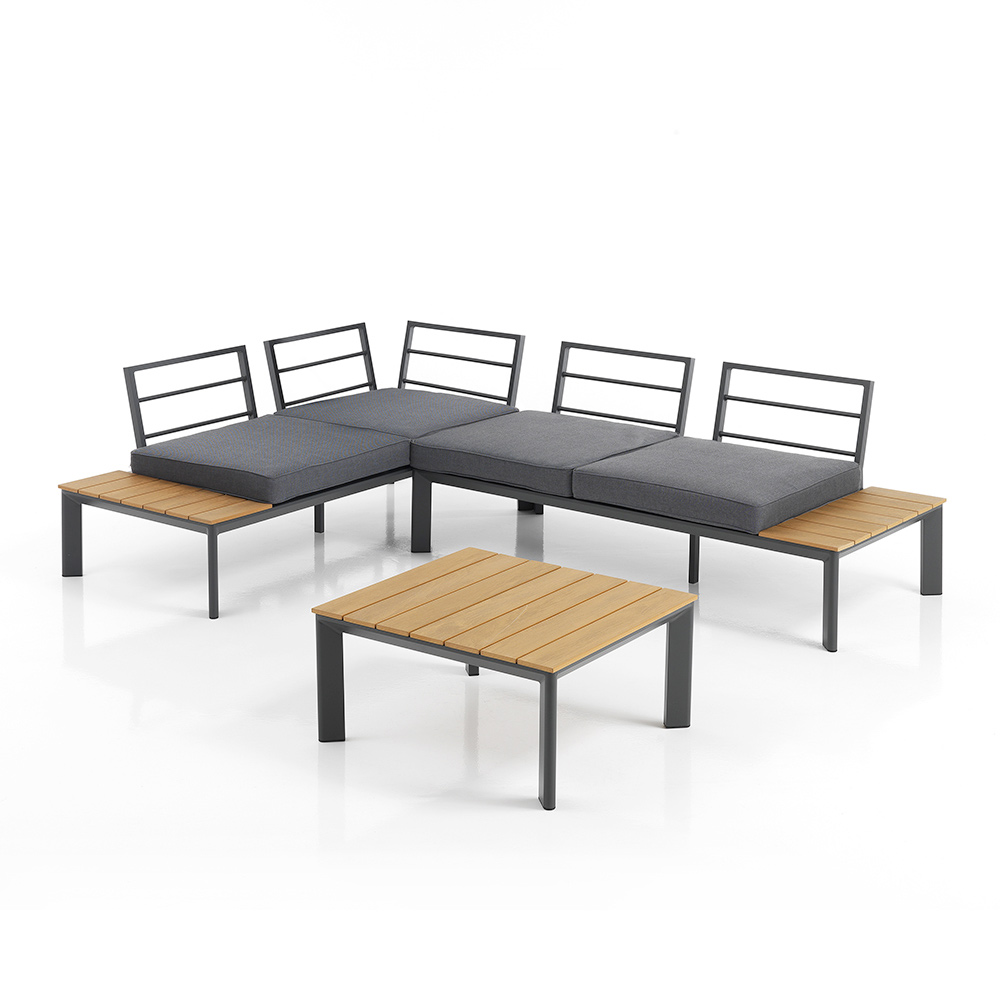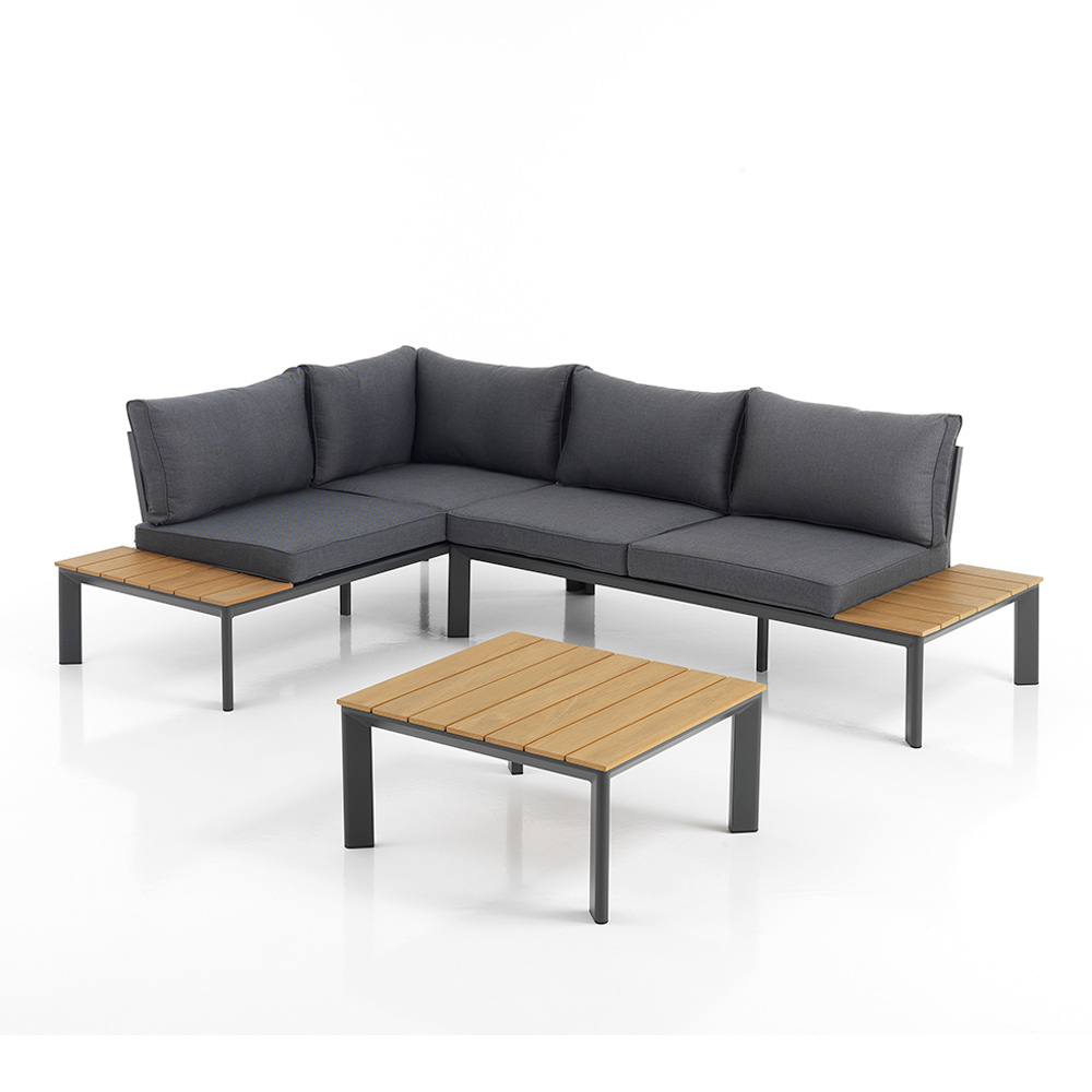 This garden lounge with coffee table embodies affordable luxury and versatile design . The unique combination of aluminium and polywood offers a sleek, contemporary aesthetic that fits seamlessly into both modern and traditional spaces. The grey polyester cushions not only provide sublime comfort, but also add a touch of sophisticated simplicity to the set.
