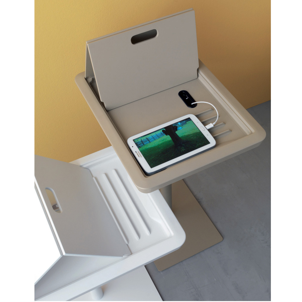 metal base and a pvc top in the same colour that can be opened and modulated. It is conceived and designed for tablet support, with a