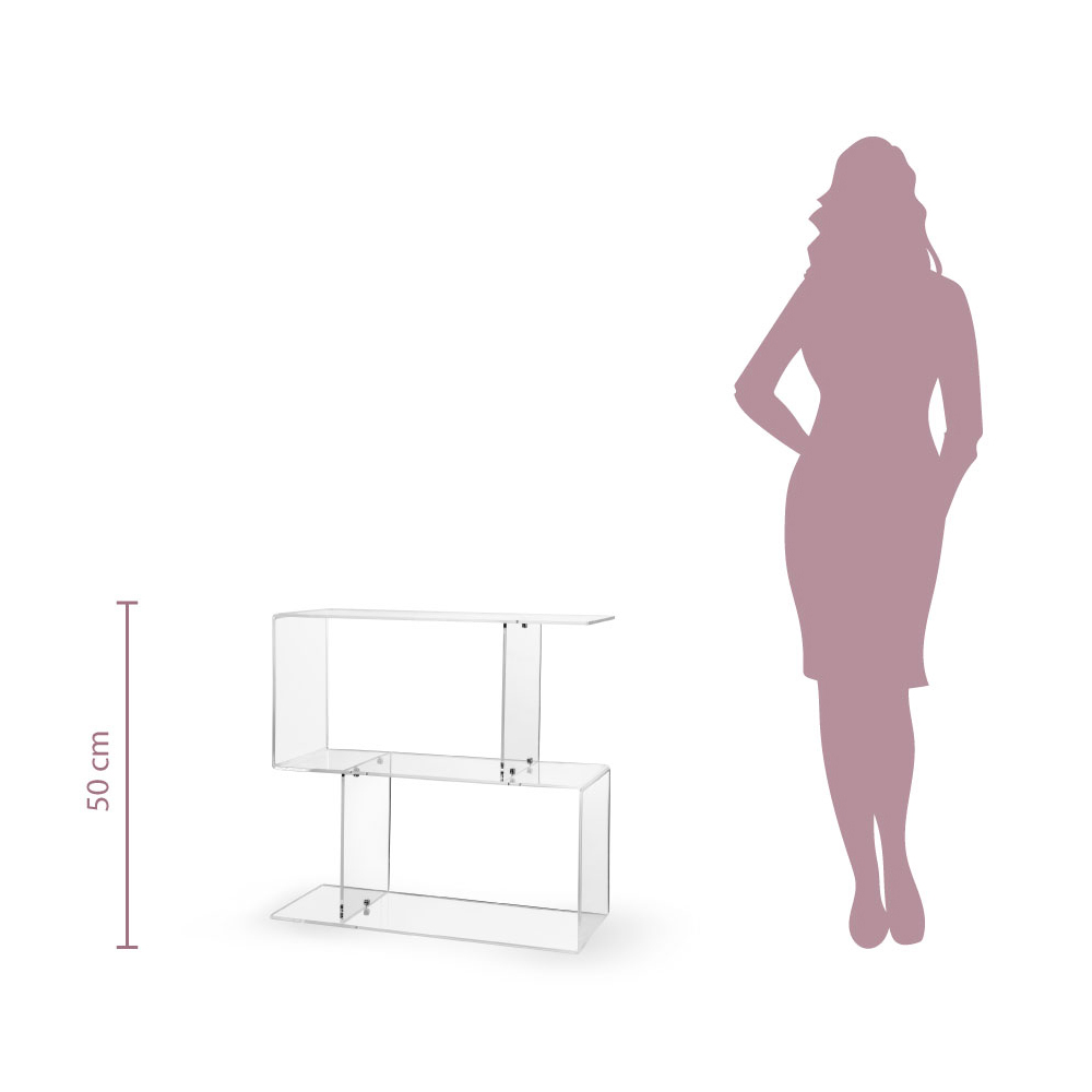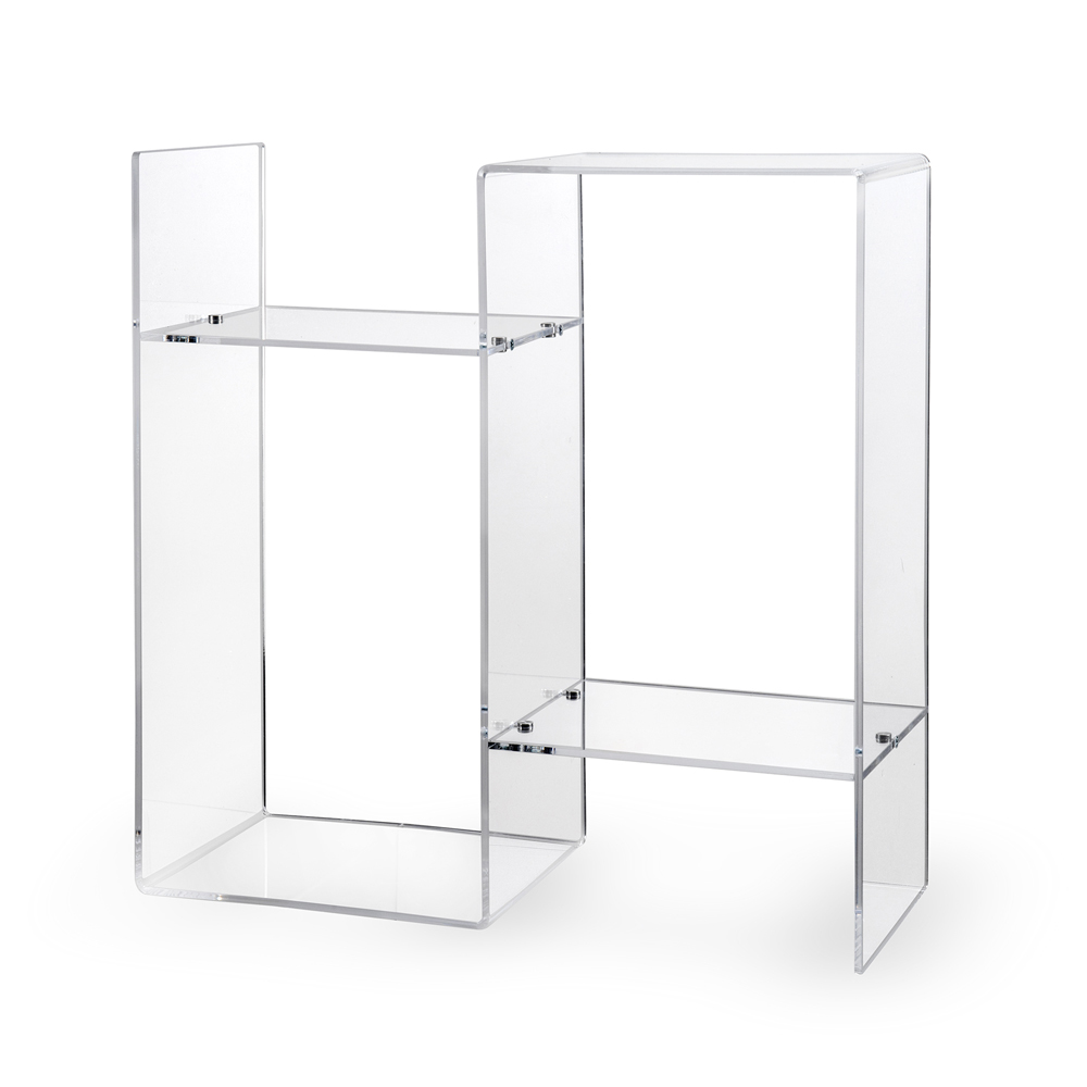 Coffee table for sofa side made entirely in Italy through the use of plexiglass , an innovative material ideal for the production of furnishing accessories as it is non-toxic, hypoallergenic, odourless, antibacterial and 100% recyclable. Its discreet and linear design has a double shelf for greater functionality and highlights its brightness and brilliance which remain constant and unchanged over time.