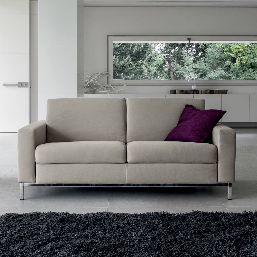 chromed metal. The sofa bed is a versatile and elegant piece, perfect for modern spaces. Its transformability allows for an easy transition from sofa to bed, offering a practical solution for guests. The simple yet refined design, with clean queues and high-quality fabric upholstery, makes it aesthetically pleasing. The soft cushions ensure comfort both as a sofa and as a bed. It is the harmony between functionality, comfort and modern style.
