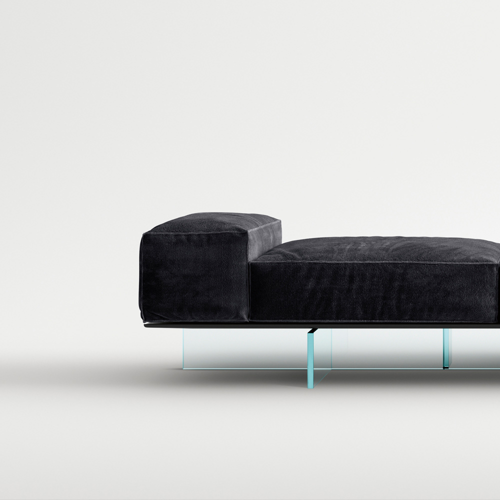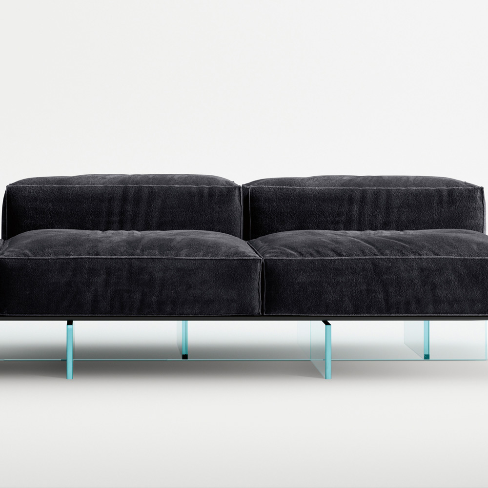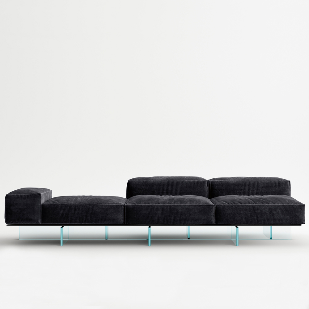Composed of soft and generously padded volumes, the seating system introduces a new way of designing the living space, with elements that allow for original, more dynamic and informal compositions. The sofa retains its visual lightness thanks to the base which is made up of laminated glass feet supporting a wooden platform on which the upholstered elements rest. Sophisticated high quality fabrics and refined details in the packaging are the distinctive features of a project with an unconventional character.