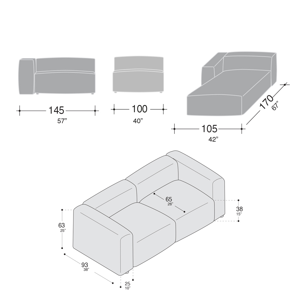 The composition includes:- 1 x 1 seater sofa with armrest - length: 145 x depth: 93 x height: 63 cm