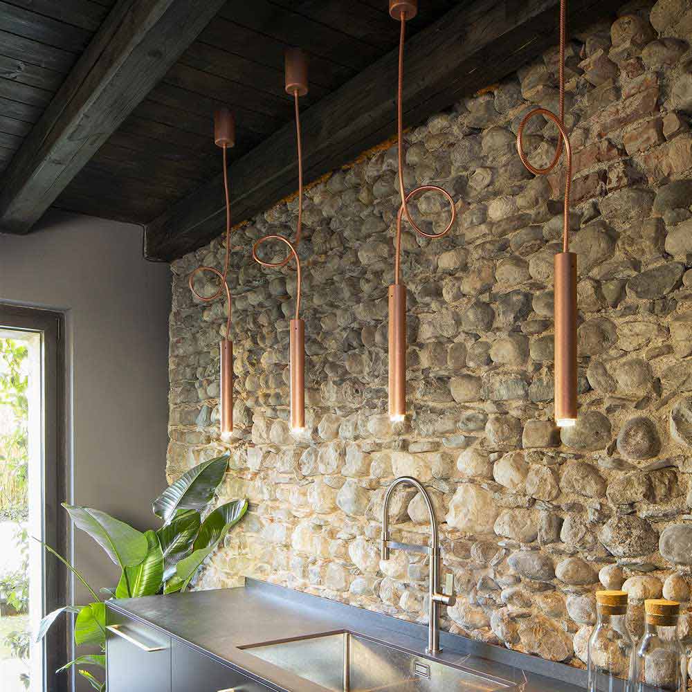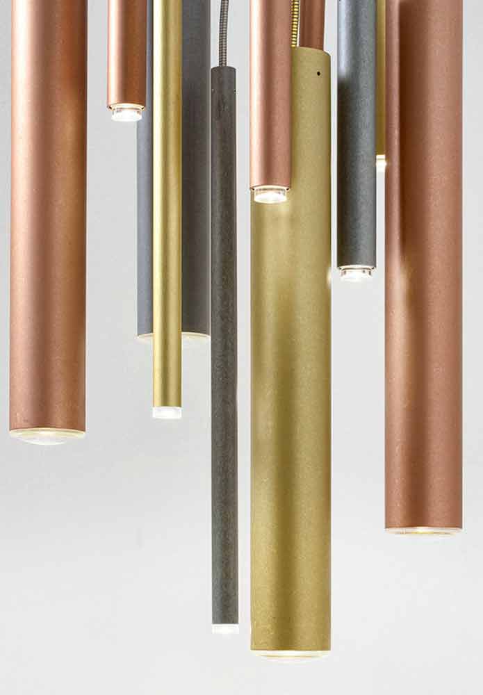 Tubò is a refined tubular suspension lamp with flexible cable, available in different materials and finishes: