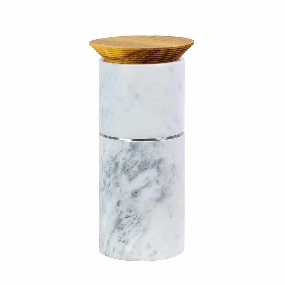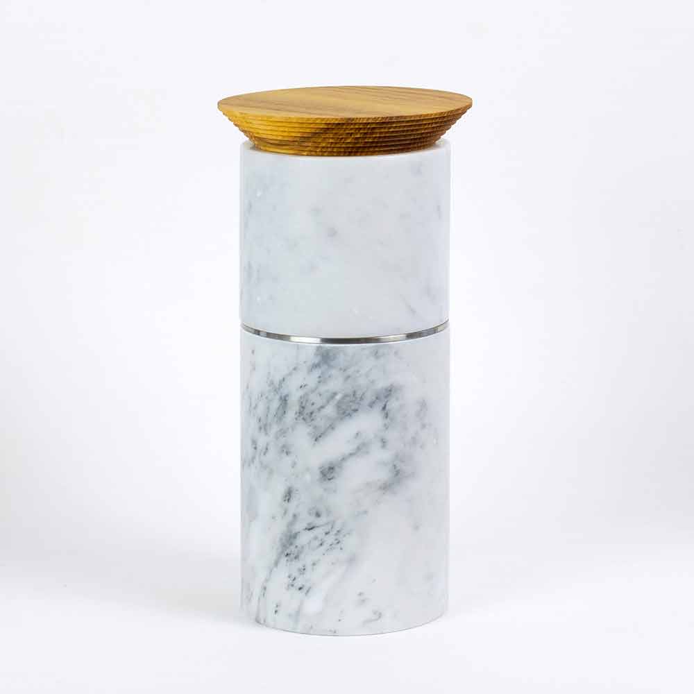Kitchen accessories tower composition in marble, wood and high quality steel made in Italy.