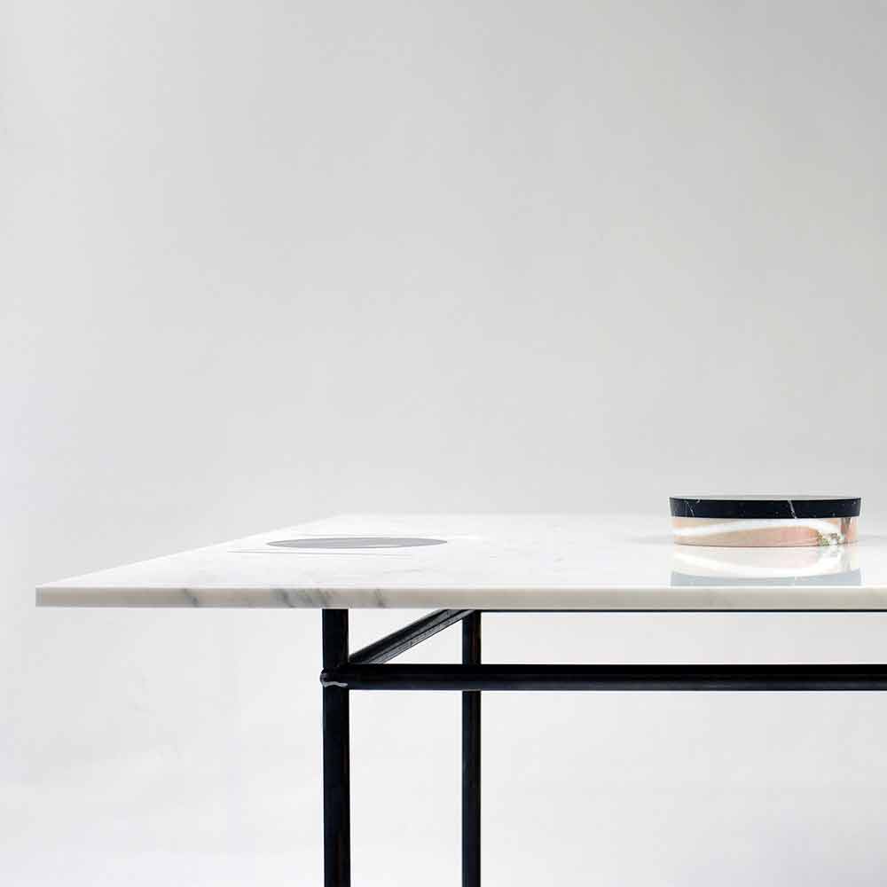 Hence an original furnishing accessory with a profound message is born, which is characterized by the presence of a hole in the central area of the top in which the raised vase made of stratified marble of different finishes can be inserted.