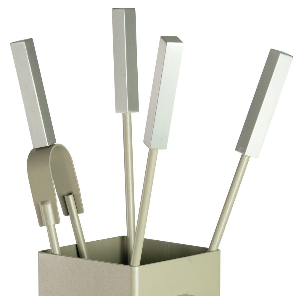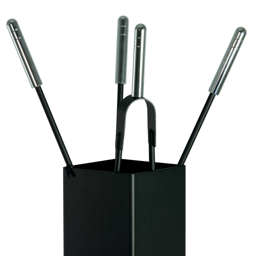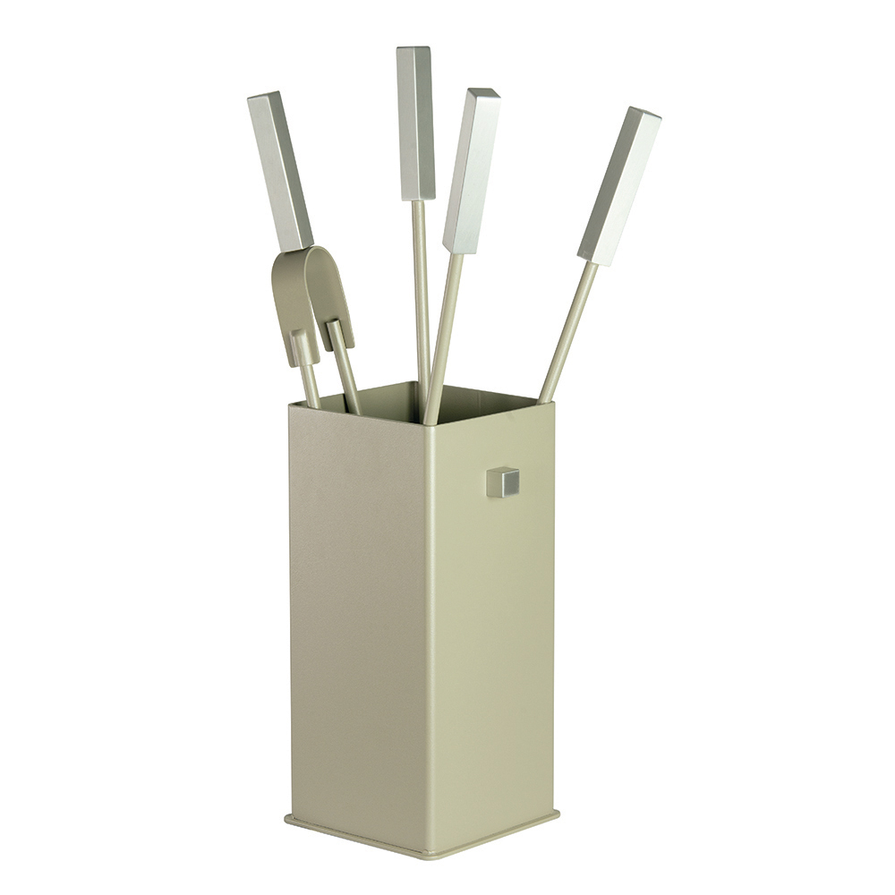 The set includes everything you need to keep your fire cosy and safe. The handles provide a secure and comfortable grip . The stand's compact design allows it to be placed in any corner without taking up space, while the refined button accent on the face adds a distinctive visual detail.