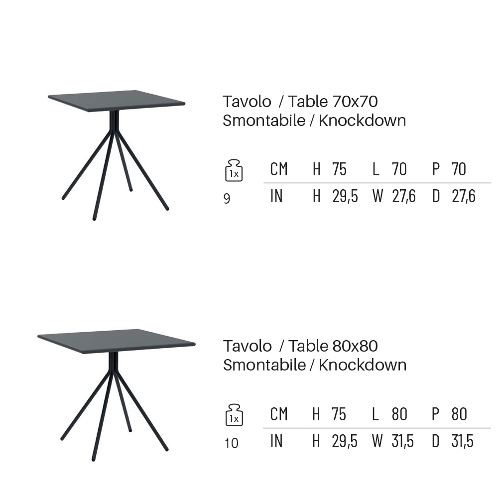 Use and maintenance : during the winter season it is advisable to store the product in closed and dry places, to avoid humidity creating condensation. If the products are located near a seaside area it is advisable to clean the surfaces every two/three months with delicate detergents. It is also advisable not to leave waterproof synthetic fabrics on the table tops for a long time because they could ruin the paintwork.