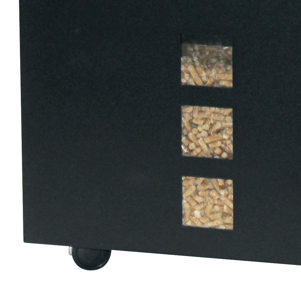 Featuring clear spaces that allow you to monitor the pellet level and add an interesting visual element to the structure, this container also features a top lid for easy filling. The wheels at the bottom guarantee the mobility of the container, allowing you to move the pellets easily from one room to another.