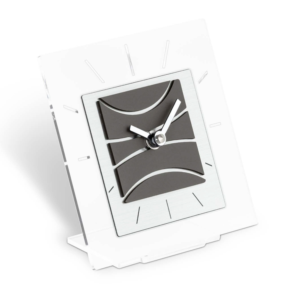 Table clock made of high density and purity transparent methacrylate , cutting of the base and dial obtained with high-tech tools, entirely Made in Italy.