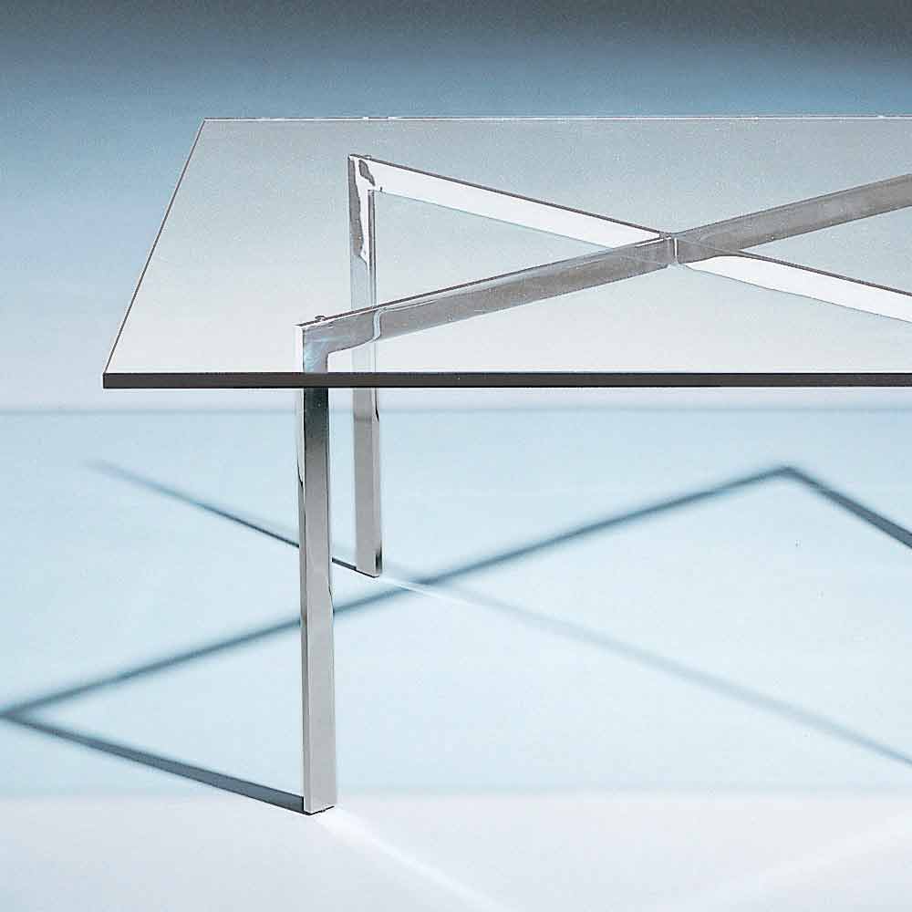Square coffee table with tempered glass top (5 mm thick) and chromed steel base . A furnishing accessory made through a 100% Made in Italy production, characterized by elements such as simplicity and design that allow it to conquer any living area with a contemporary style thanks to its versatile personality and its extreme essentiality . Its peculiarities are represented by the glass top which gives the aesthetics of the product elegance and character and by the steel base which ensures a solid and resistant product thanks to the use of quality materials . The result is a sober and elegant coffee table capable of characterizing any stylistic situation with an exclusive and refined touch .