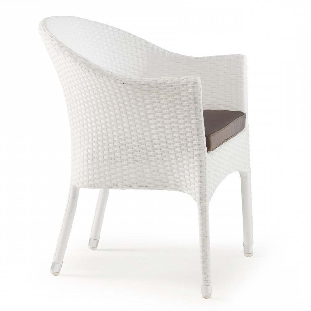 garden armchair made with an aluminium frame covered with white wicker and a seat cushion in mocha-colored fabric.
