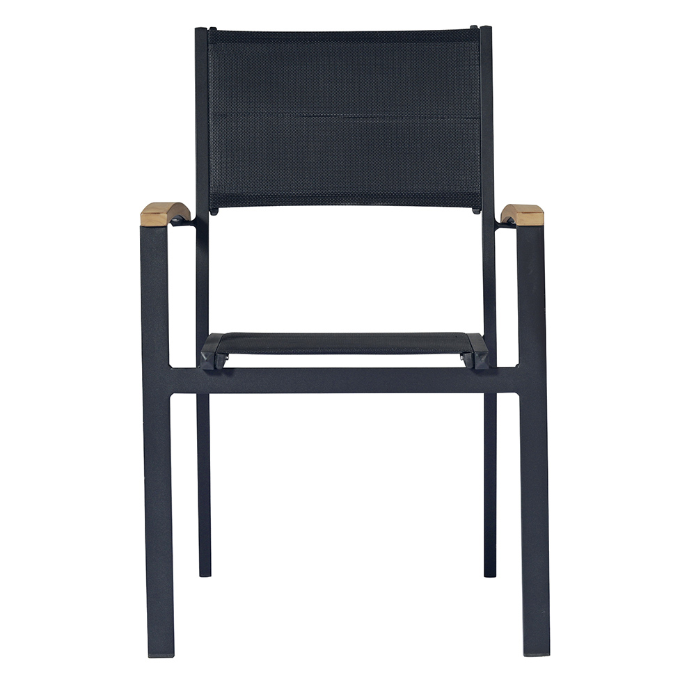 Garden chair made of anthracite grey aluminum with seat and back in black padded textilene complete with elegant teak armrests . The shapes of the structure adapt best to the silhouette of the body to offer great comfort thanks also to the practical armrests that allow you to maintain a correct and comfortable position . Ideal for furnishing your outdoor spaces with a touch of unique style and a strong modern personality .