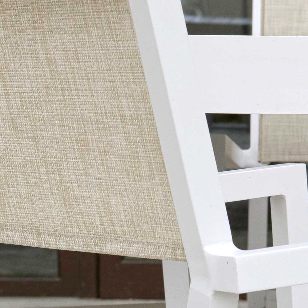 The sturdy structure in matt white aluminum guarantees durability and resistance to the elements, maintaining its beauty over time. The beige textilene covering not only adds a touch of class with its refined texture, but also offers unbeatable comfort thanks to its elasticity and breathability.