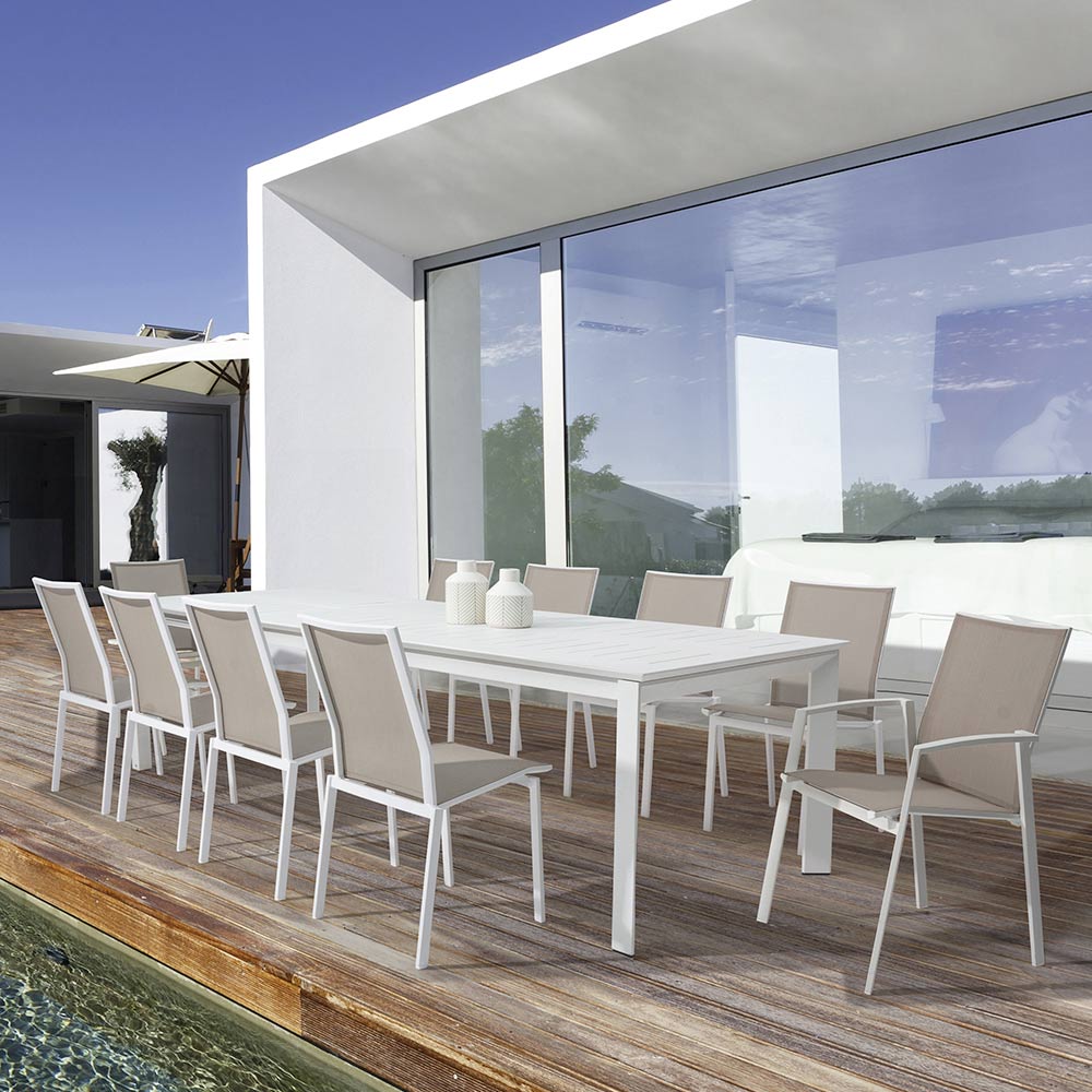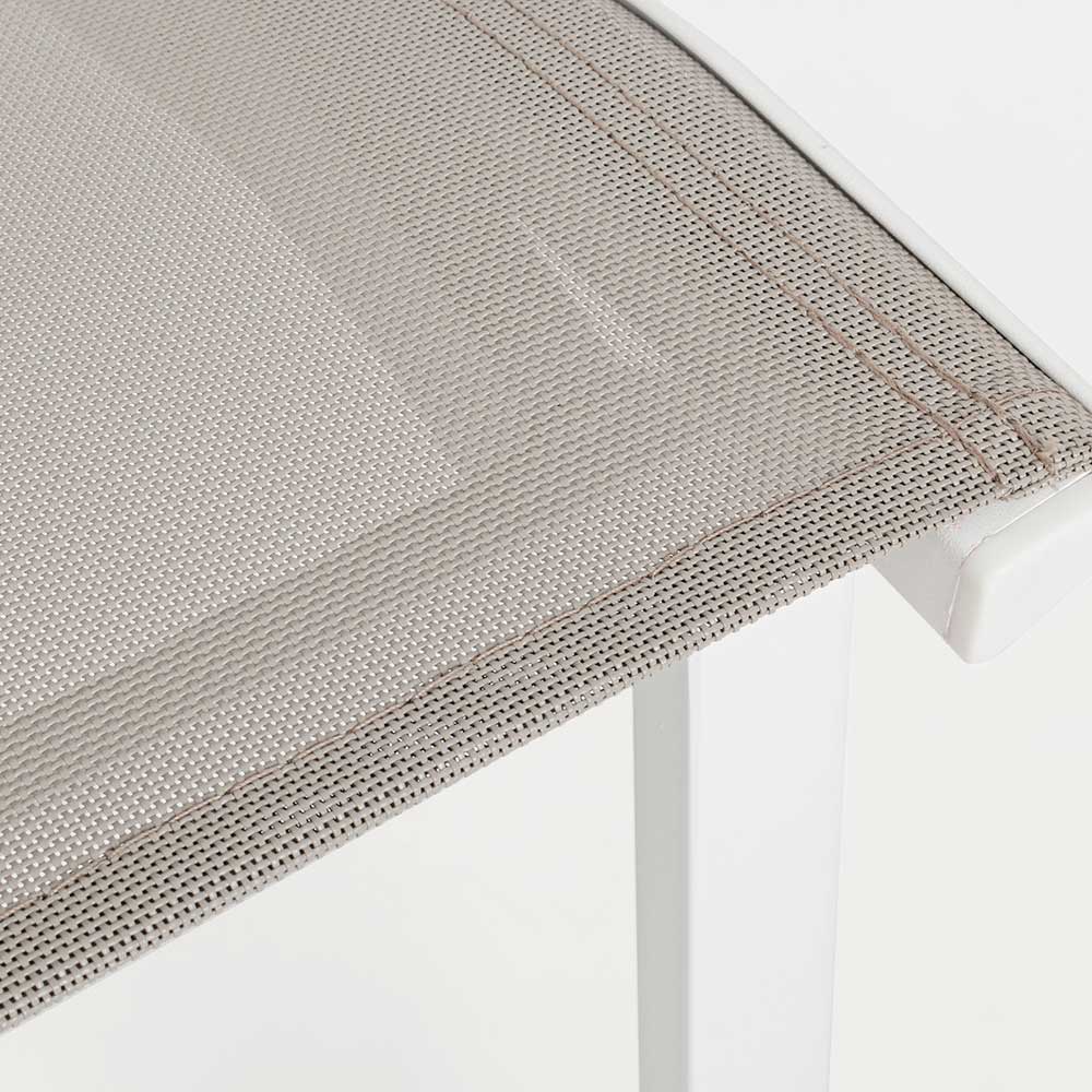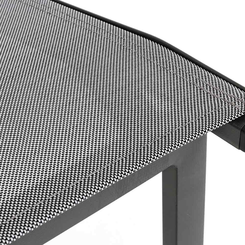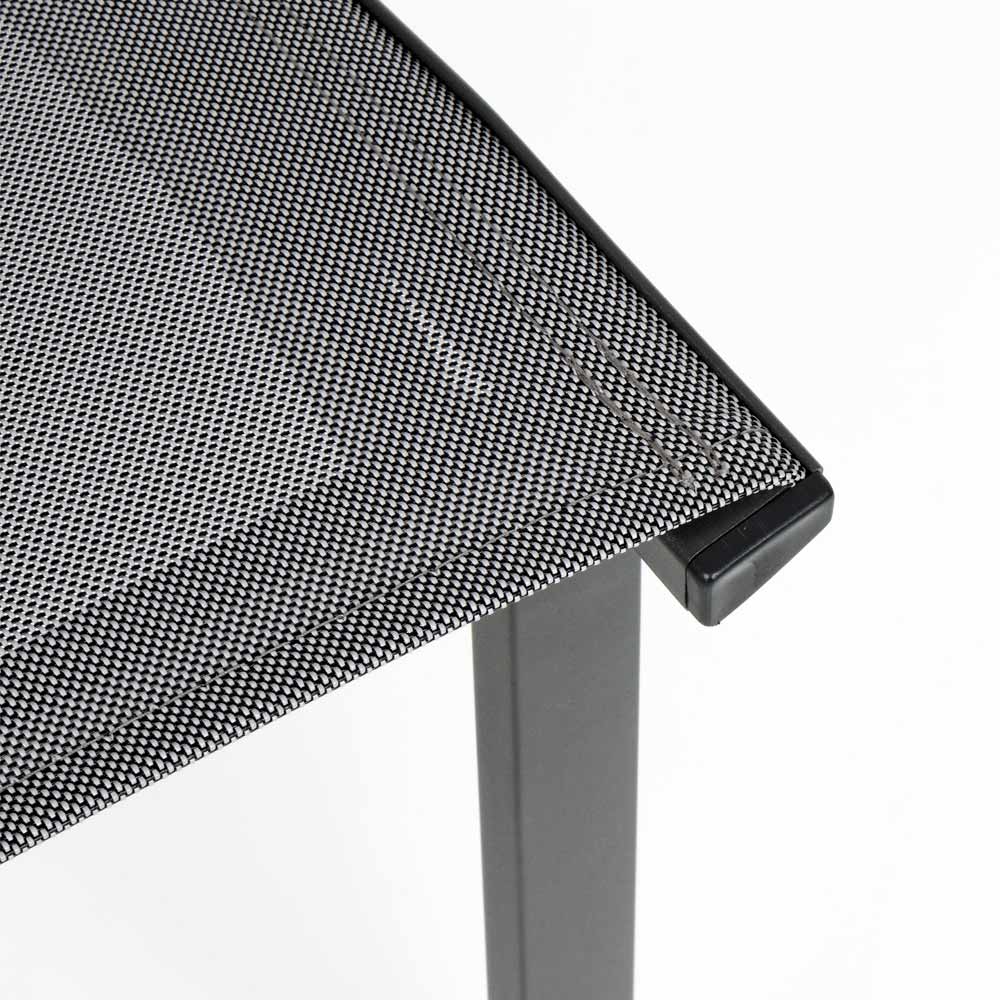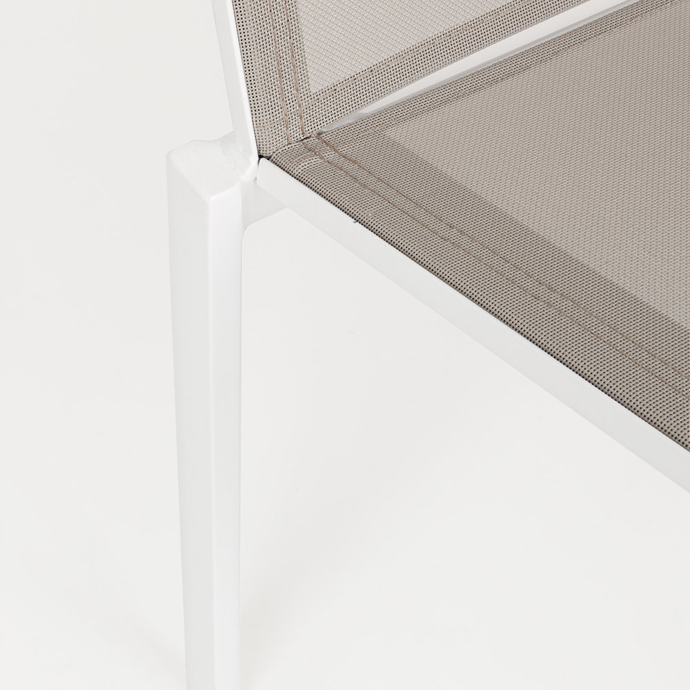 coated aluminum structure (polyester). Seat and back upholstered in 1x1 Phifer textilene. Stackable.