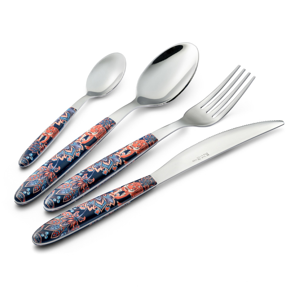 Stainless steel cutlery set and colored plastic handle with tiger, 24 pieces made in Italy.