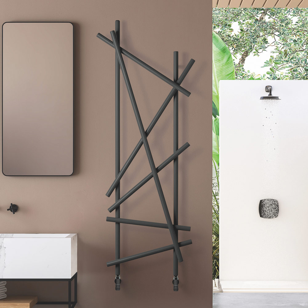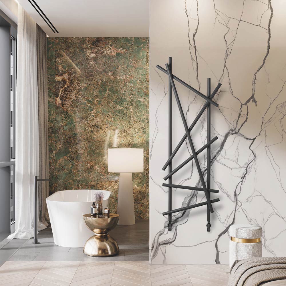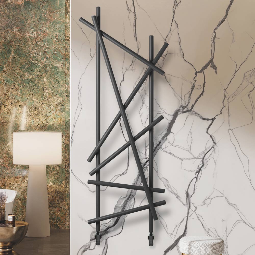 This steel radiator stands out for its innovative and artistic design, ideal for those looking for a functional element with a strong aesthetic impact for their environment. The irregular and crossed queues not only maximise the diffusion of heat but also transform the heater into a true work of wall art. The matte black finish gives a touch of modernity and class, integrating perfectly with any colour scheme and interior design, as demonstrated by the elegant marble walls and metallic accents of the surrounding environment.