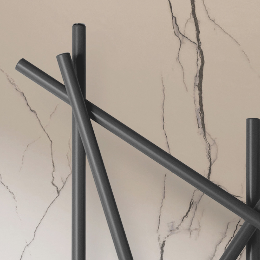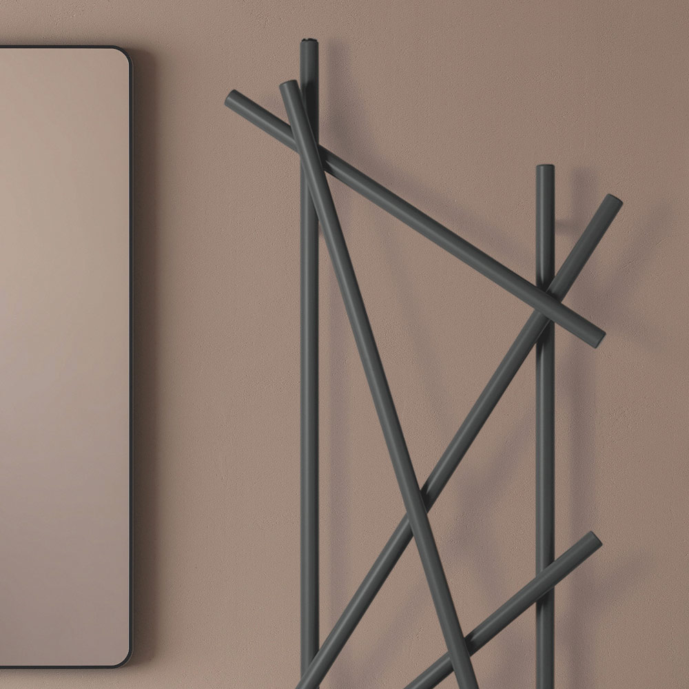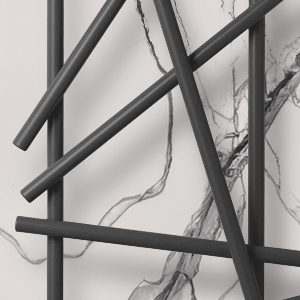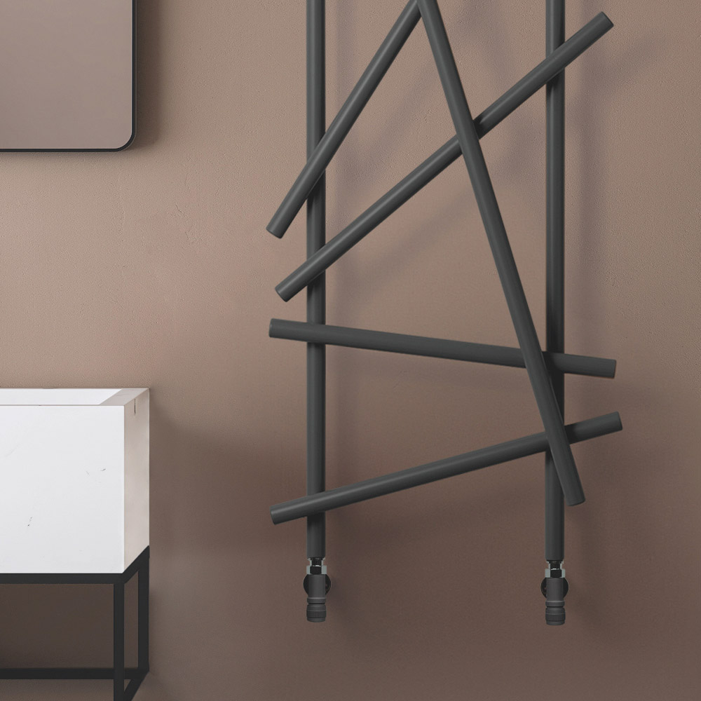 This steel radiator stands out for its innovative and artistic design, ideal for those looking for a functional element with a strong aesthetic impact for their environment. The irregular and crossed queues not only maximise the diffusion of heat but also transform the heater into a true work of wall art. The matte black finish gives a touch of modernity and class, integrating perfectly with any colour scheme and interior design, as demonstrated by the elegant marble walls and metallic accents of the surrounding environment.