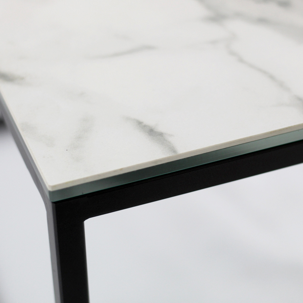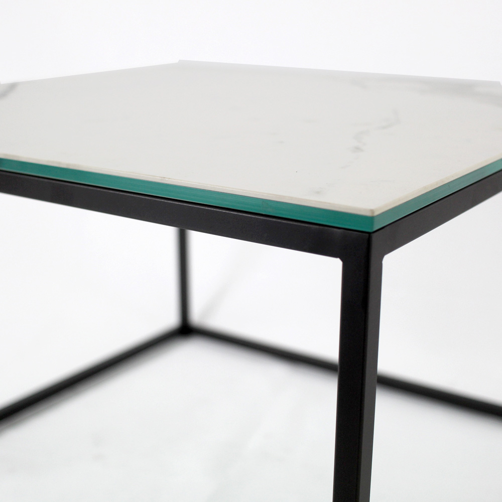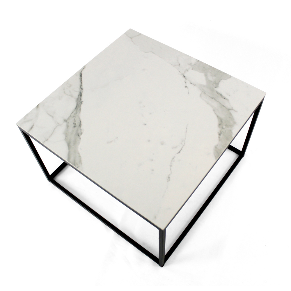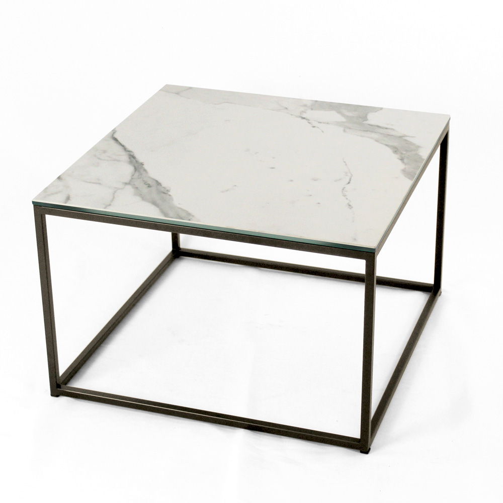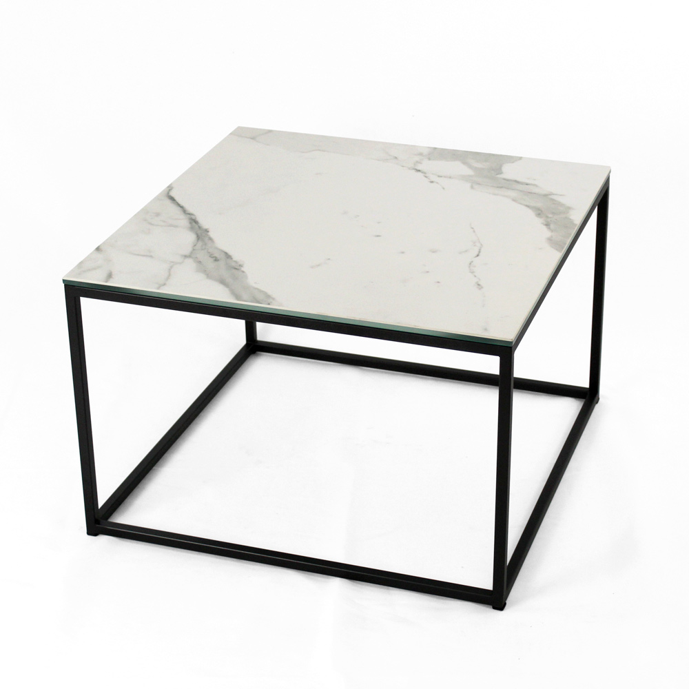 Square coffee table with painted steel base and top in 3mm matt veined statuary white stoneware laminated with 6mm float glass. The modern style coffee tables represent the perfect piece of furniture to complete the decoration of any lounge and lounge. These products are unique, elegant and functional at the same time thanks to their simple and harmonious finishes that make them suitable for any need and occasion of use. The materials used for the construction guarantee great quality and resistance even with the passage of time.