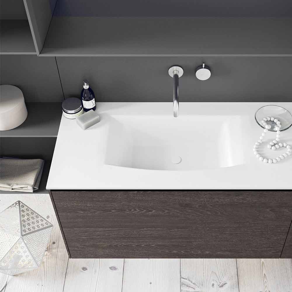 The scene is concluded by the built- in washbasin characterized by two lateral sides that gently descend towardss the basin.