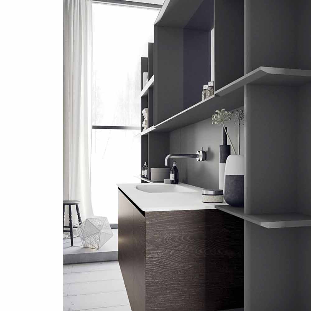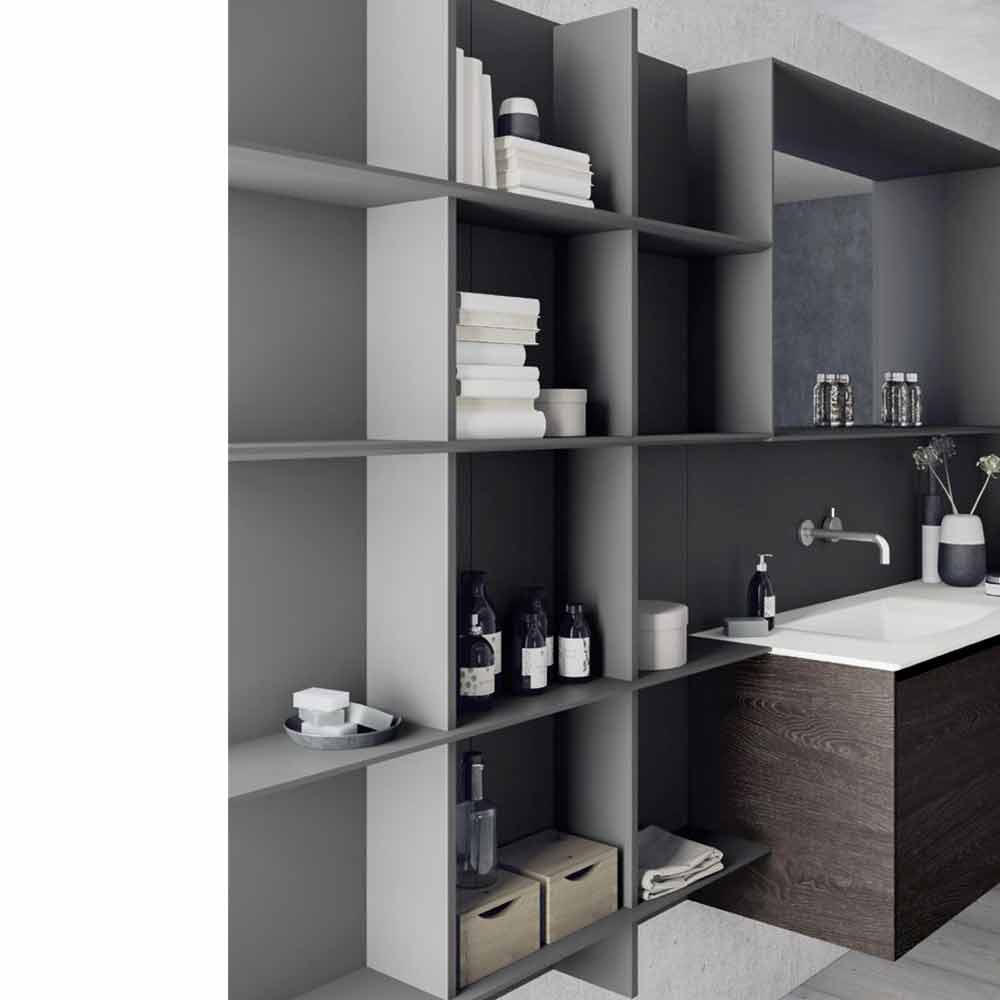 Modern bathroom composition, suspended and regular design with open shelves, made in Italy.