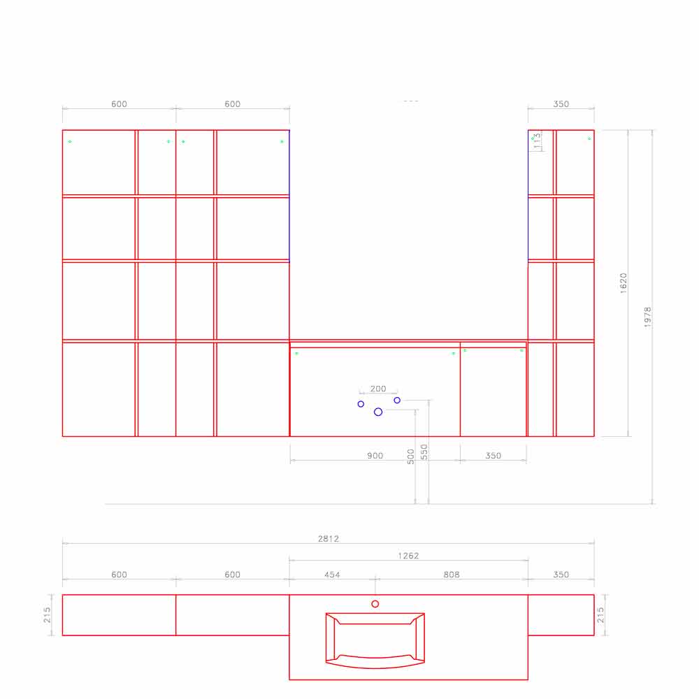 The peculiarity of this composition is given by the regularity and symmetry of the design of the entire final composition, which creates a strong sense of continuity and stability, like a painting of important dimensions that assumes visual lightness thanks to the play of volumes of the open shelves, asserting touch of modernity.