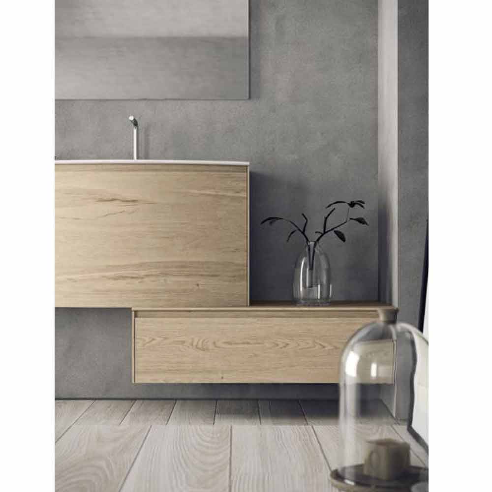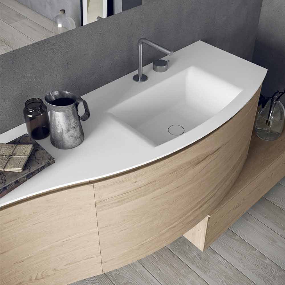 The peculiarity of this composition is given by the built-in washbasin characterized by two lateral sides that gently descend towardss the basin and by the underlying curved wall unit, which breaks the regularity of the structure for a more welcoming atmosphere.