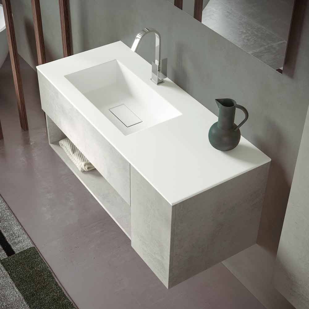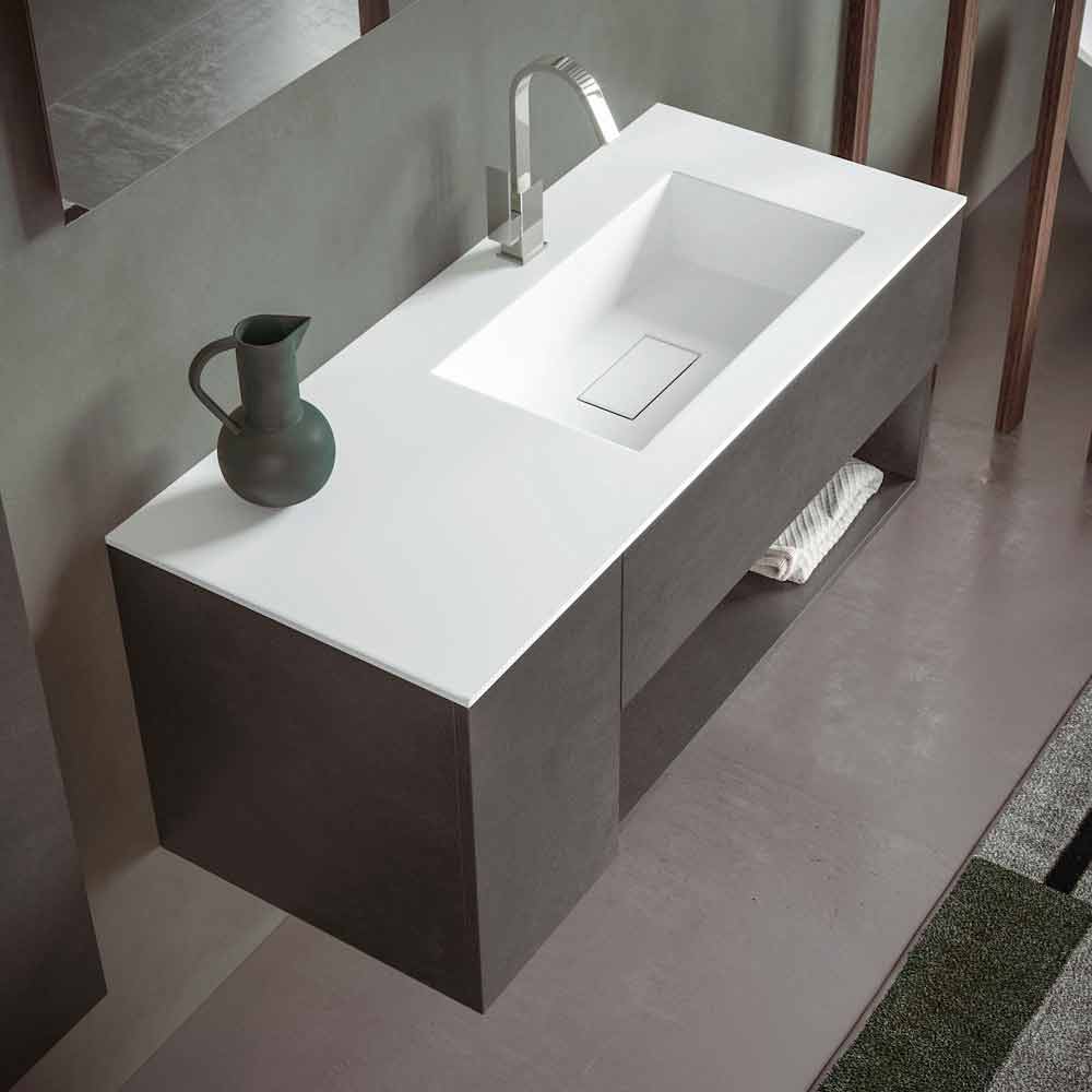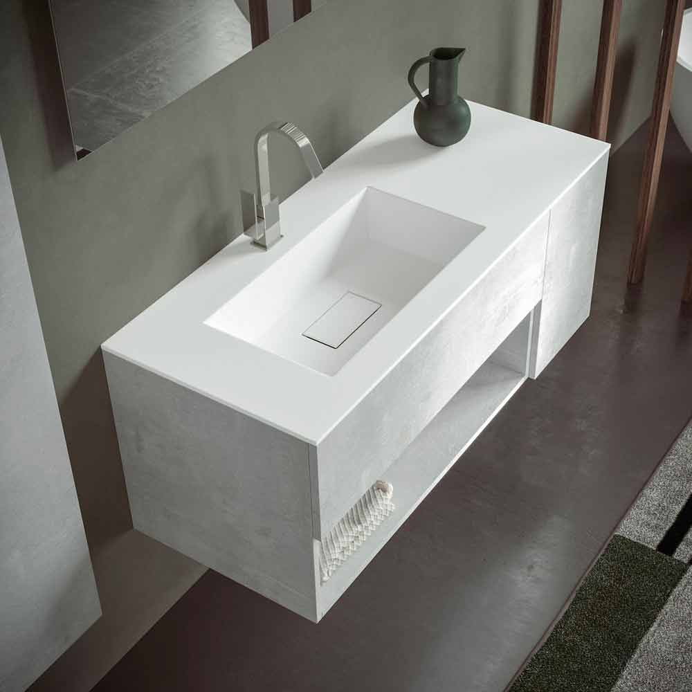 The washbasin base unit with drawer and open compartment is made of laminated and water-repellent hydro W 100 wood fibre , in order to ensure greater durability and prevent the cabinet from being damaged in contact with water.