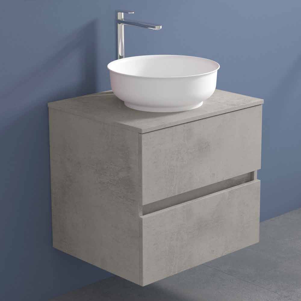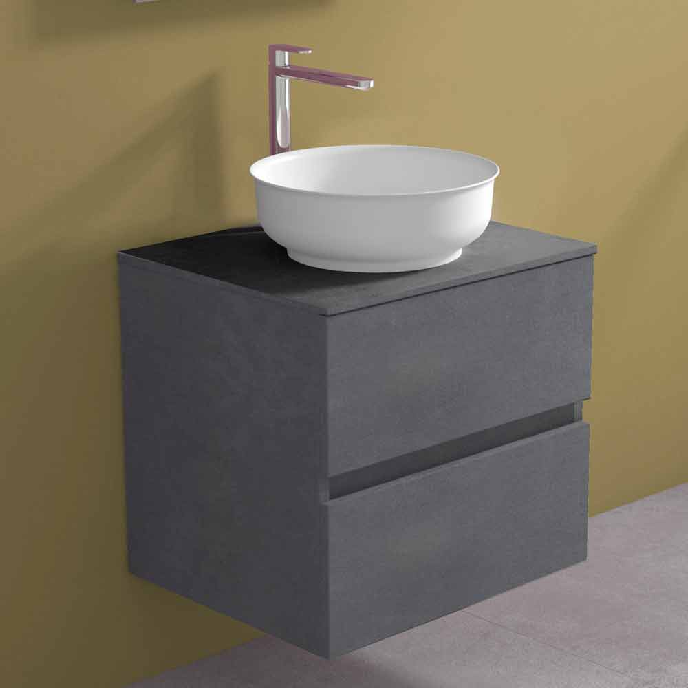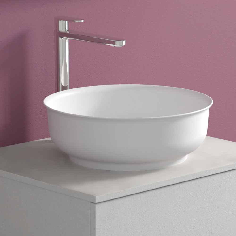 The round countertop washbasin is made of Solid matt, an opaque white mineral resin , and finished in opaque gelcoat , which makes the product waterproof.