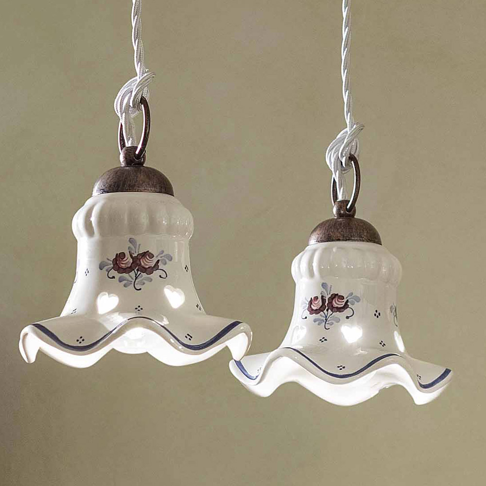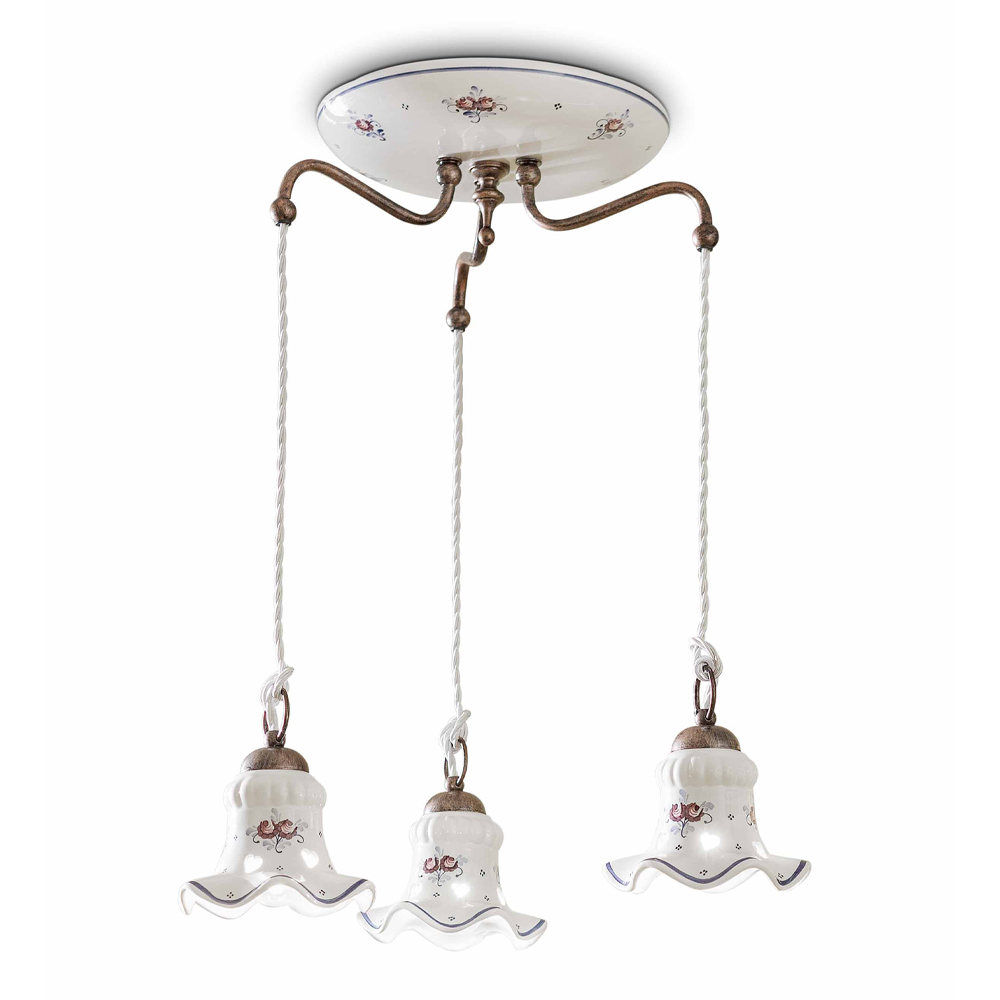Round pendant lamp 3 lights in iron and hand-decorated ceramic, made in Italy by Ferroluce.