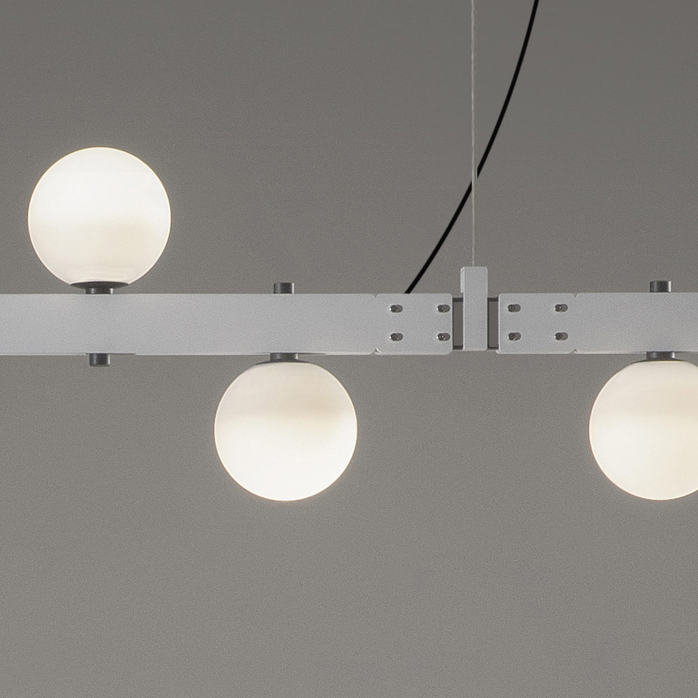 The load-bearing bars recall the engineering structures of the past and the electrified modular structures support lighting bodies ( blown glass spheres and spotlights ) that can be placed in quantity and free arrangement, without the use of electrical power cables, for maximum expressive freedom. .