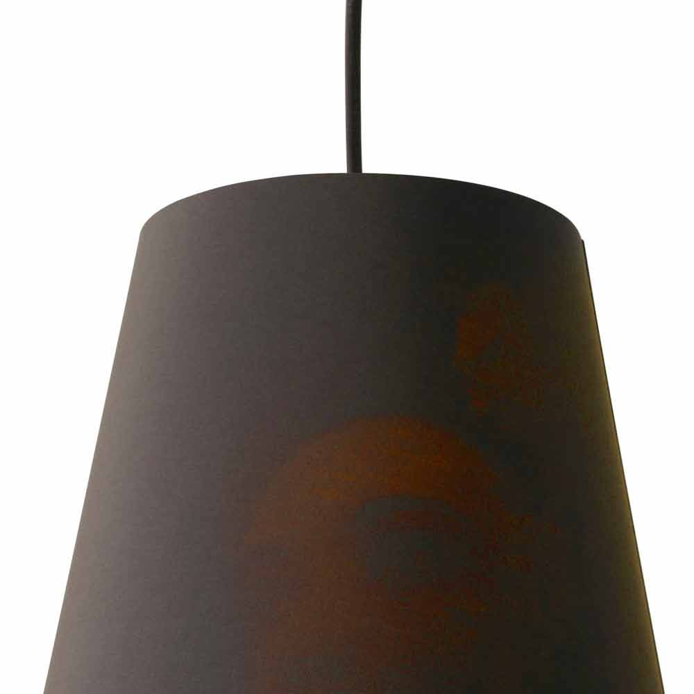 This original and unique suspended lamp was created with the aim of making the world of technical and decorative lighting coexist and coexist. A complement in which aesthetics and functionality are combined in favour of a contemporary design consisting of an anthracite fabric lampshade that gives a "see I do not see" effect of its interior, which hides its main peculiarity: a modern internal print of the face of a woman, capable of arousing suggestive atmospheres and breaking traditional schemes.