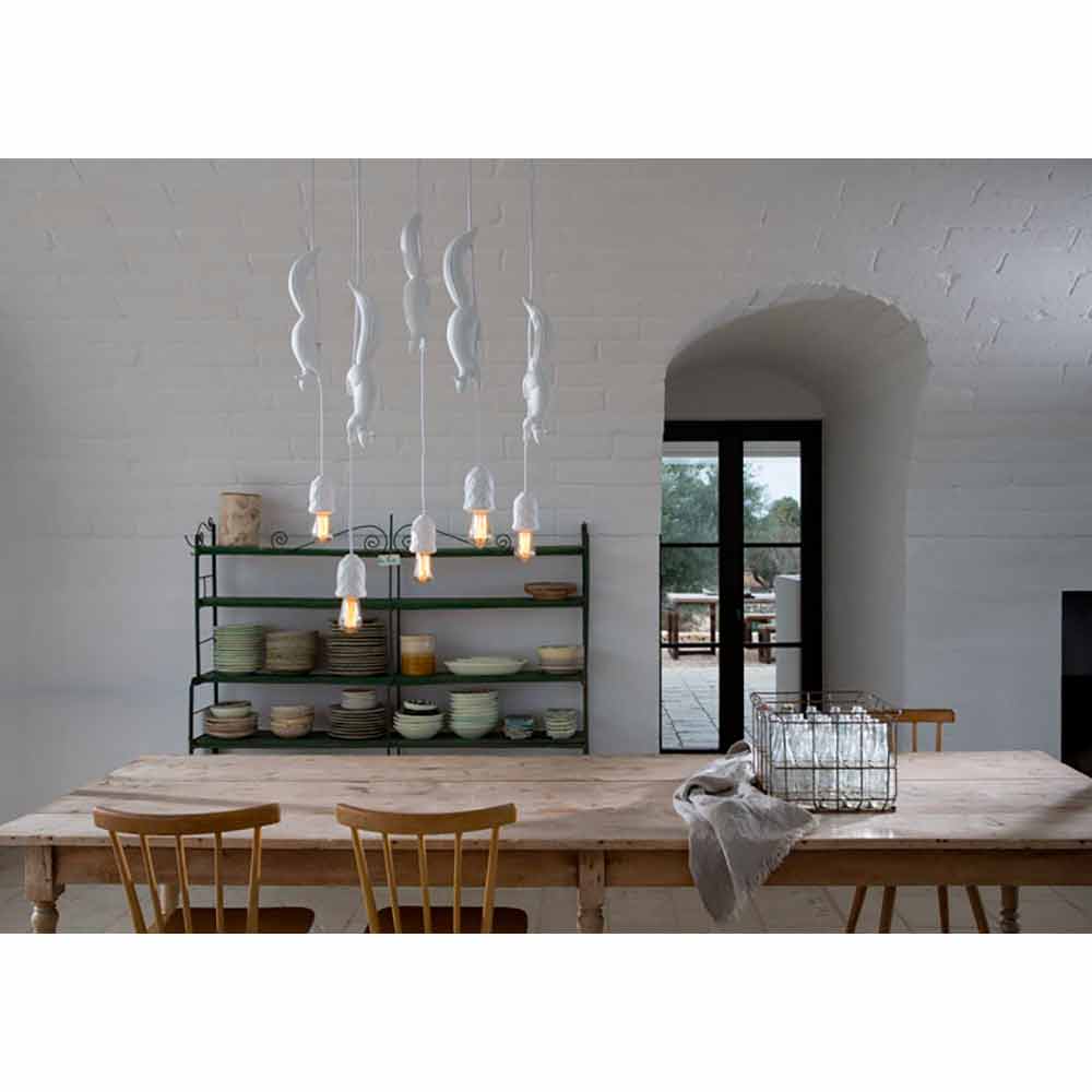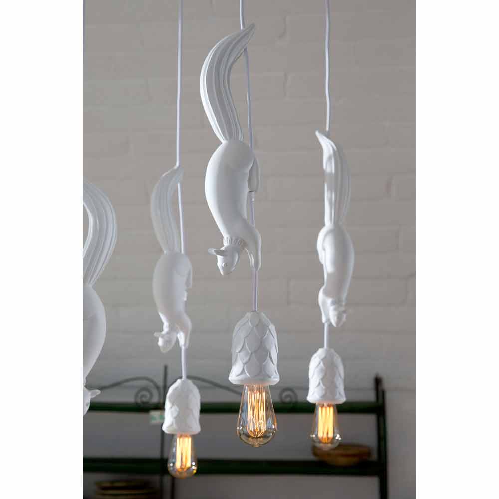 This original and singular suspension lamp has an original and modern design with the representation of the bulb that becomes an acorn ready to be picked up by the animal that descends along the wire. It is a high-impact complement, for fun and elegant atmospheres, like the fruits of a luminous undergrowth that want to highlight the authenticity and the thousand shades that characterise the personality of each, through the representation of luminous elements with a unique design and innovative.