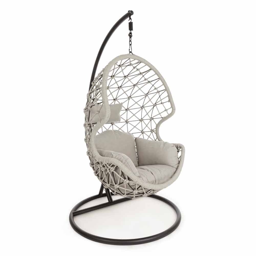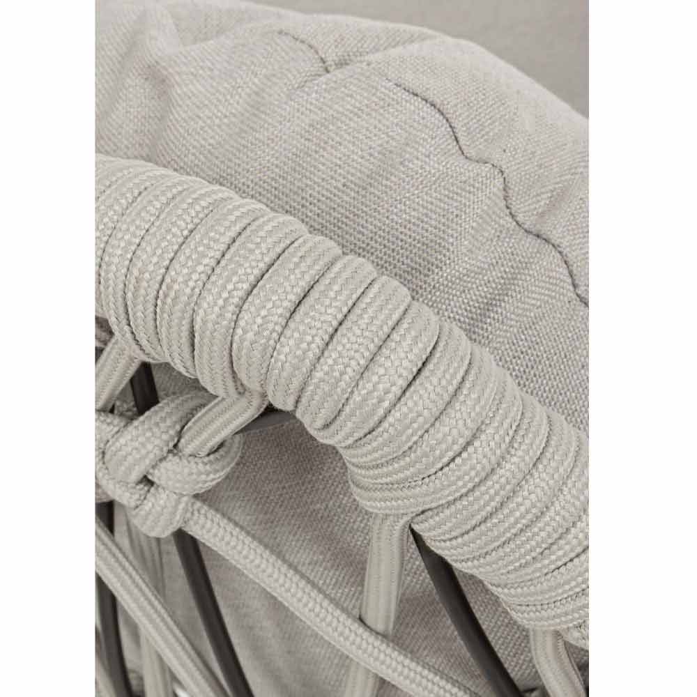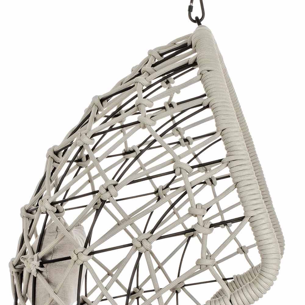 Suspended outdoor armchair in steel and rope with removable cushions.