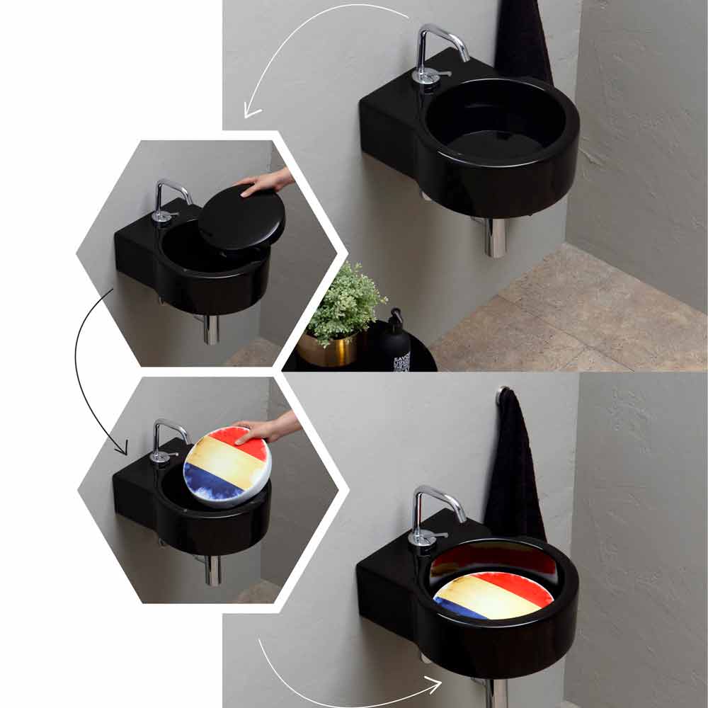 The peculiarity is that it is a hand wash basin with continuous flow water, with the possibility of being installed as a support or suspended.