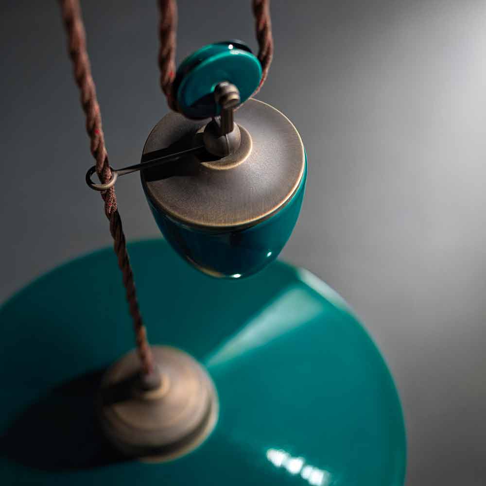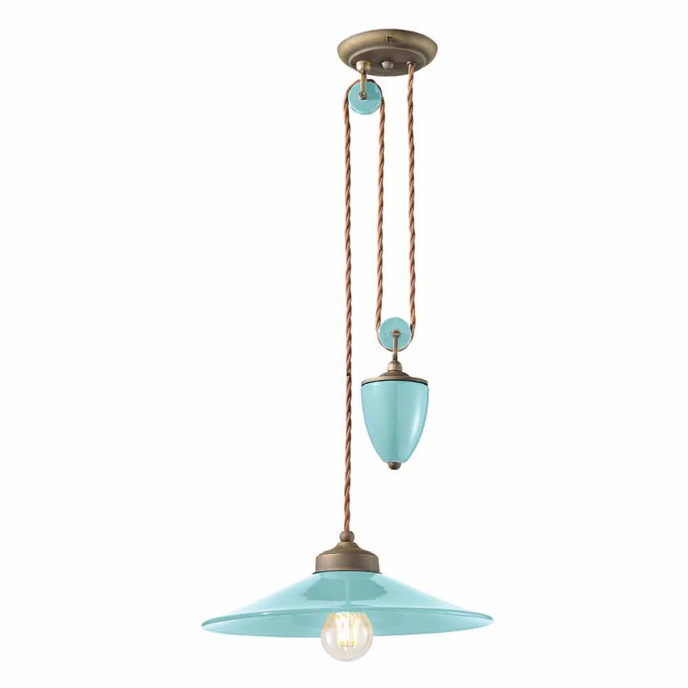 This beautiful suspension consists of an antique brass structure with a diffuser made of glossy colored ceramic, available in different colours.