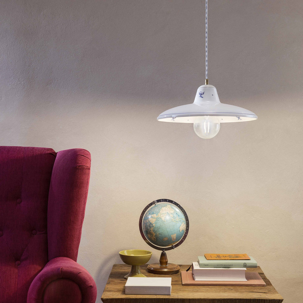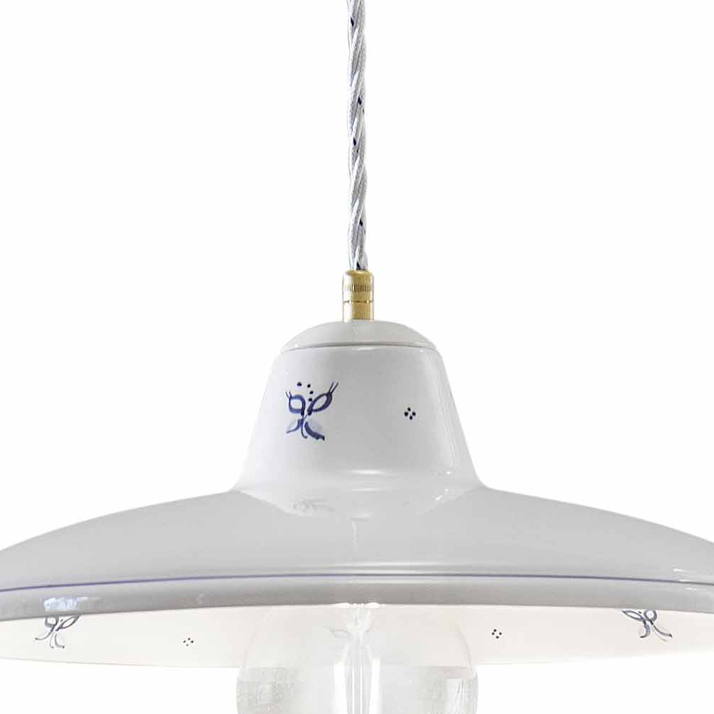 Hand-decorated iron and ceramic pendant lamp, made in Italy by Ferroluce.