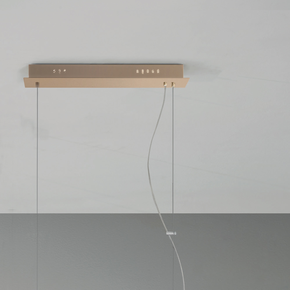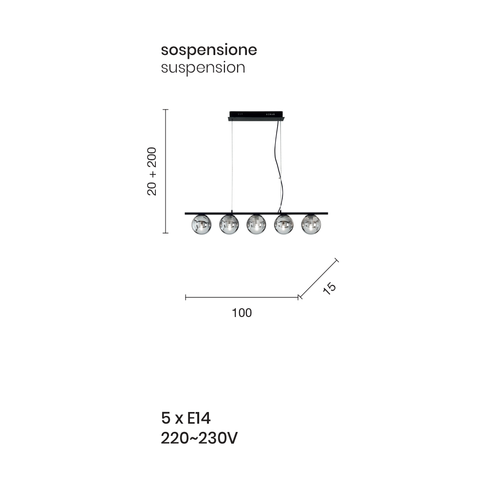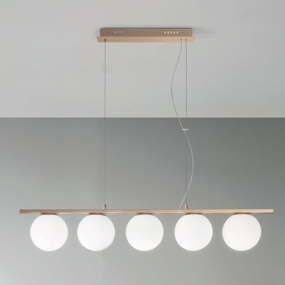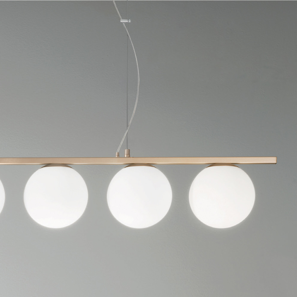 Suspension lamp with gold finish metal structure and spherical blown glass diffusers complete with height-adjustable cables. From the perfect combination of the modern touch of metal and the timeless elegance of blown glass comes an original and refined furnishing solution capable of gaining the centre of attention within domestic environments with a contemporary taste. Its structure develops on a single queue which makes it a particularly suitable solution for illuminating your table in the dining room or kitchen.