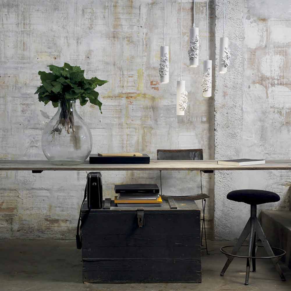 The simple ceramic cylinder is wrapped in a whirlwind of flowers that is highlighted by the purity of the stylistic queues and the material. There are no excesses, the perfectly balanced design can thus be inserted in various contexts , from the most modern for a touch of pure elegance, to the most classic and industrial ones, for a contemporary atmosphere and a contrast that excites.