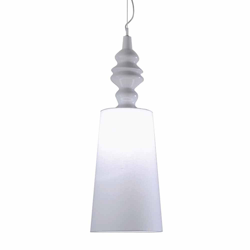 The lamp is made of glossy white ceramic as a material that represents the origin, the malleability, the creation and that leads directly to the origins of our culture. Lampshade in white linen.