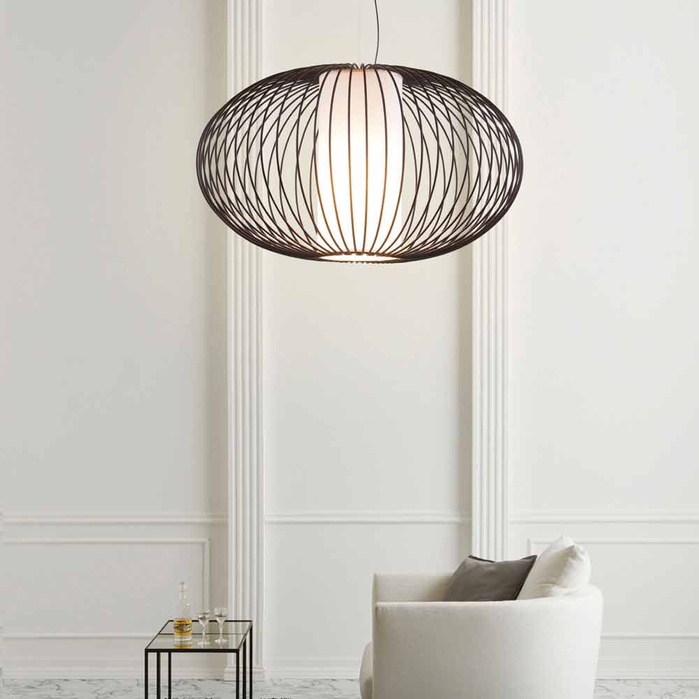 Suspension lamp from the structure in steel rod painted with epoxy powders with white textured fabric shade.