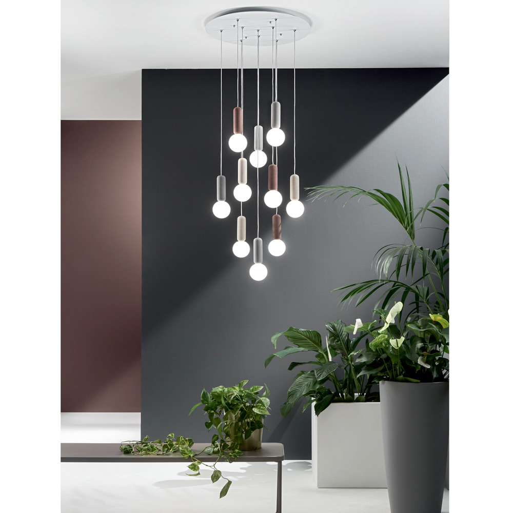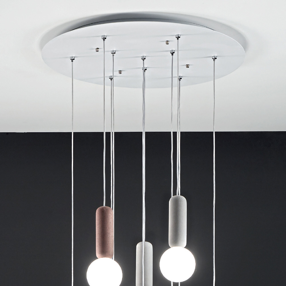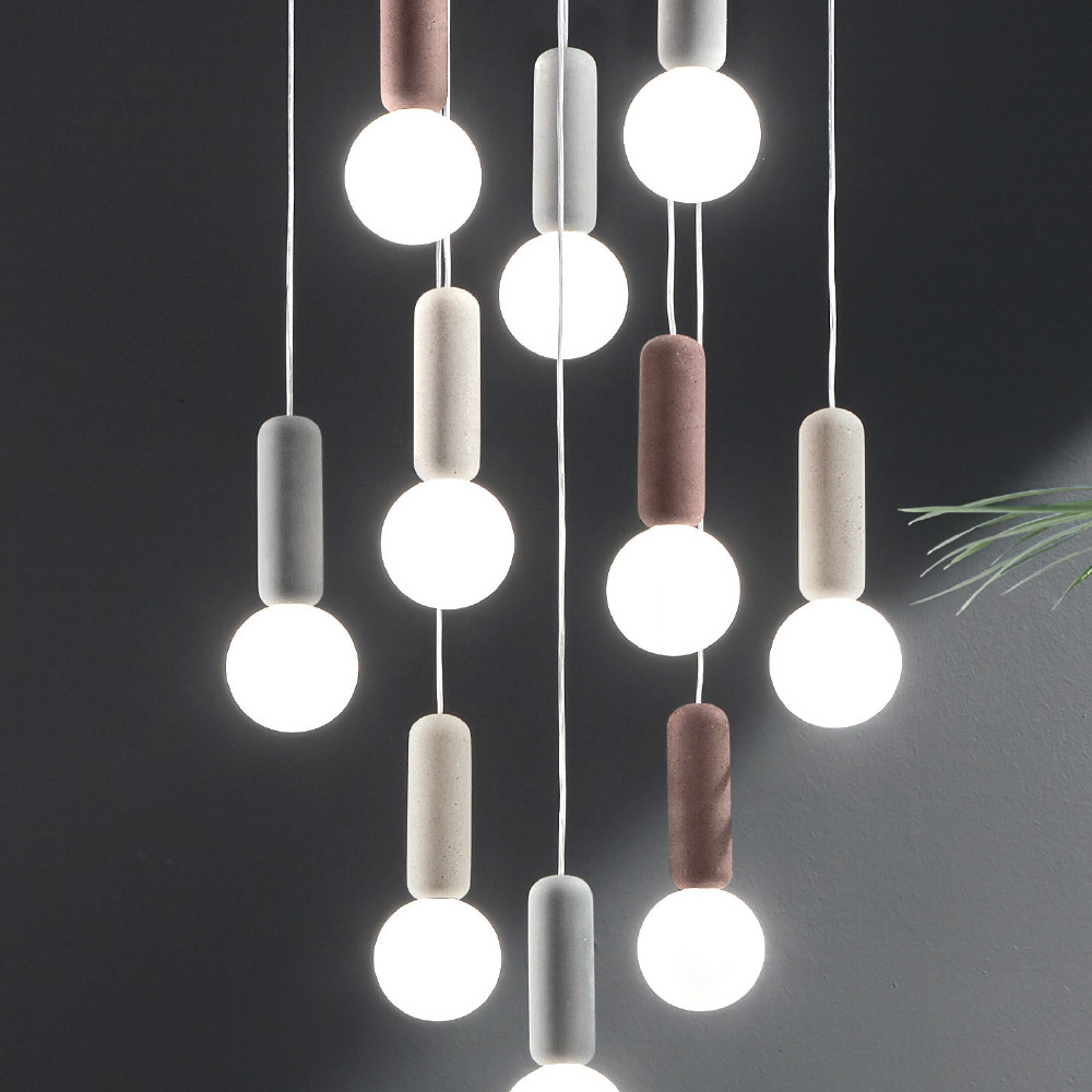 satin white glass complete with cables adjustable in length. An unusual and creative combination of materials and finishes that brings to life a furnishing solution that is as eccentric as it is elegant and modern. The wonderful colour nuances chosen for the concrete components combine impeccably with the delicate and romantic finish of the glass lampshades for a result with a