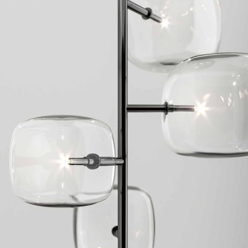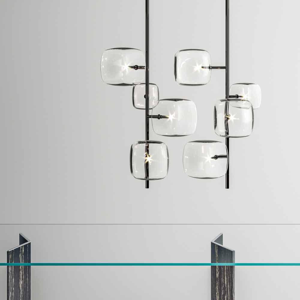 This suspension lamp is made in Italy and represents an extremely elegant and high-impact lighting idea that helps to create an environment with a refined and modern atmosphere. Its polished metal structure includes 4 or 5 rounded cubes in transparent blown pyrex glass depending on the size chosen. Also ideal for multiple installations at different heights, thus giving movement and refinement to the product design. G4 3000K LED light and dimmable bulb.