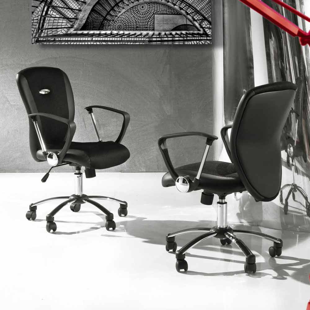 Swivel chair with office wheels with chromed metal frame, fabric seat and backrest in black technorete.