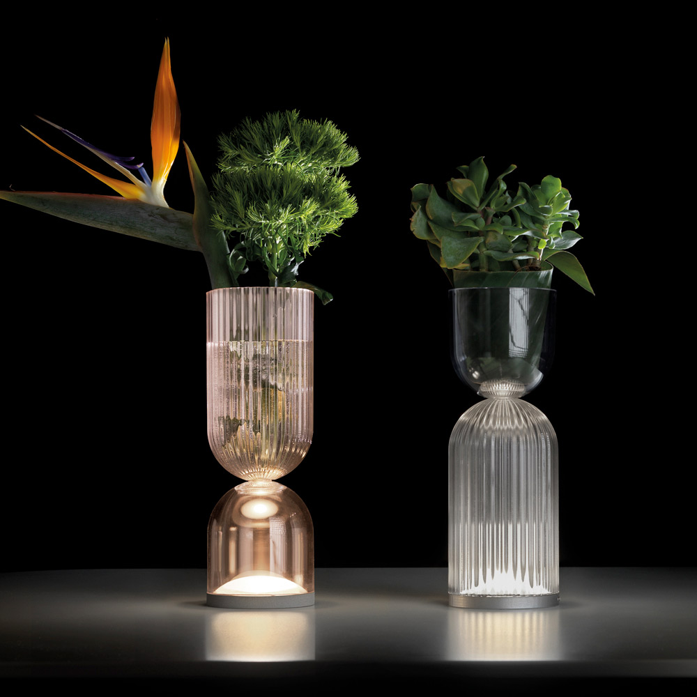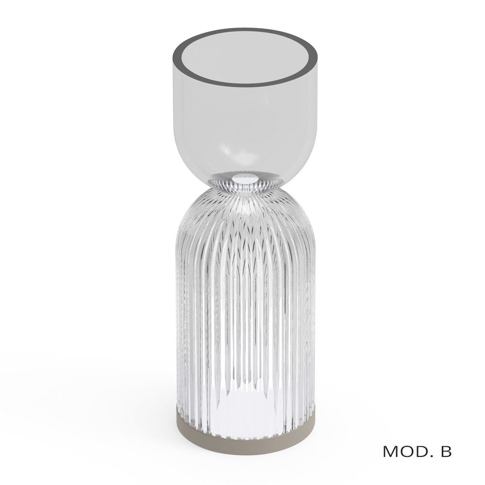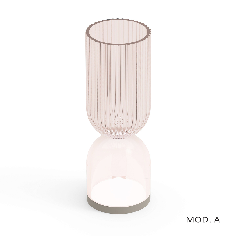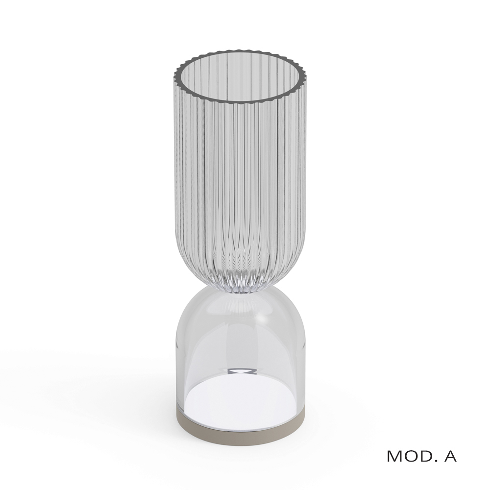 This lamp is a stunning fusion of modern design and classic elegance. The structure is half made of polymethylmethacrylate worked with delicate vertical incisions , which create a fascinating visual effect when the lamp is turned on, projecting a play of light and shadow that enriches any environment.